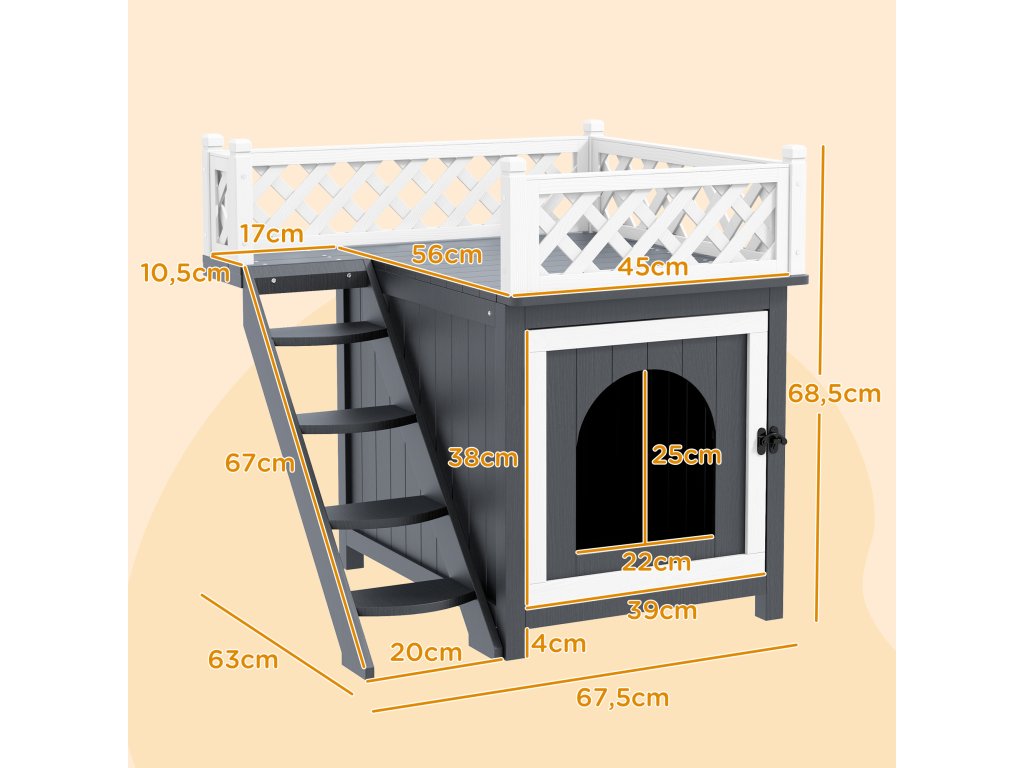 - Informace o domku pro kočky: Celkové rozměry: 67,5L x 63W x 68,5V cm. Vhodné pro malou kočku nebo králíka do 6 kg. Je nutná montáž