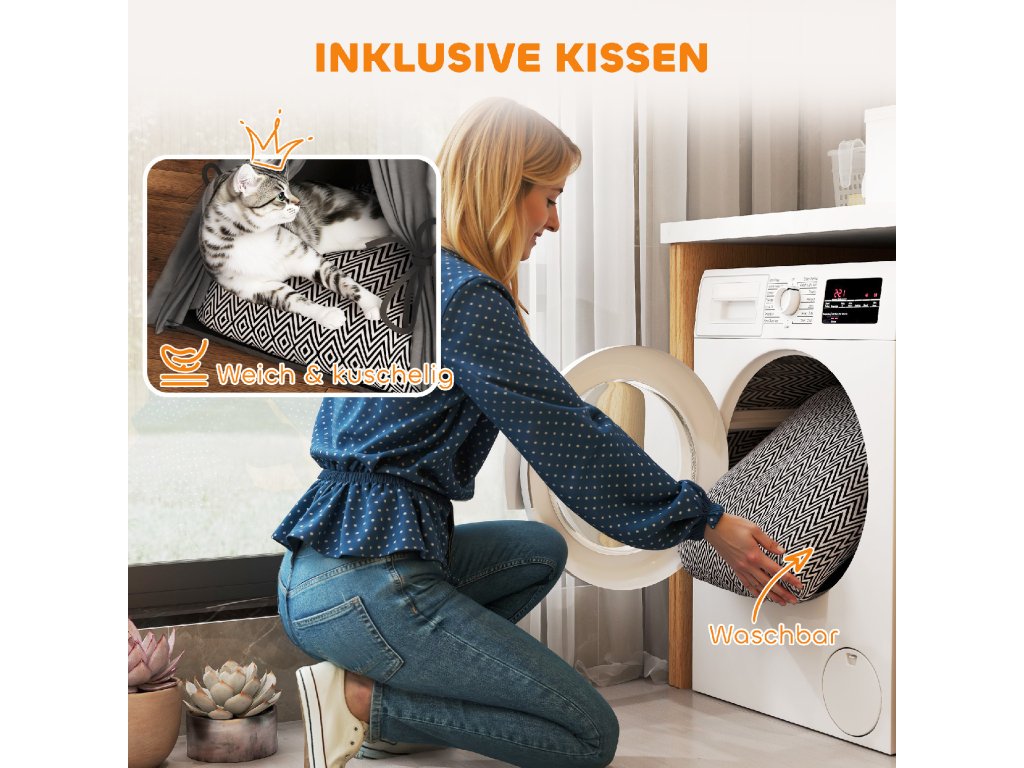 - Měkký polštářek v domečku pro kočky je silně polstrovaný a obzvláště měkký, takže váš chlupatý přítel je vždy v teple a bezpečí. Celý polštář lze prát v pračce