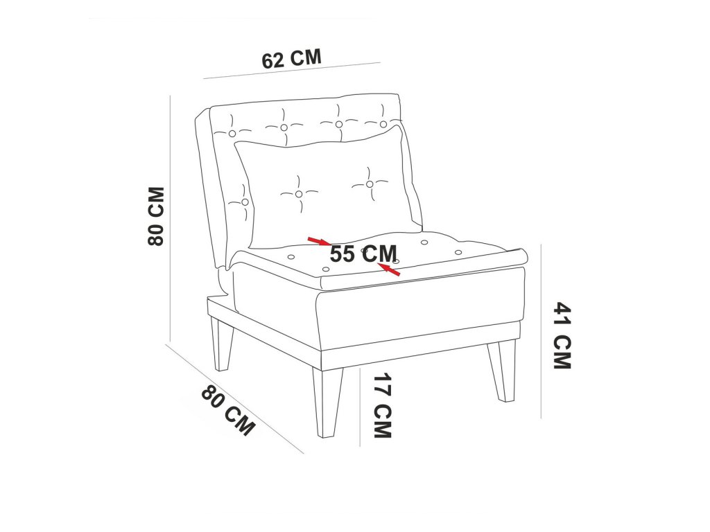 Rozměr křesla: Šířka: 62 cm Výška: 80 cm Hloubka: 80 cm Hloubka sedáku křesla: 55 cm Výška sedáku křesla: 41 cm Rozměr lůžka: Šířka: 107 cm Hloubka: 62 cm Výška nohou: 17 cm