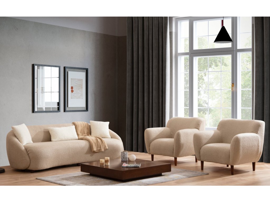 Rám: BUK / MDF, sedák: 28 DNS pěna (8 cm), záda: 24 DNS pěna + peří (5 cm), Látka: 100% snadno čistitelný POLYESTER béžové barvy, Nohy z ořechového dřeva (6 cm)