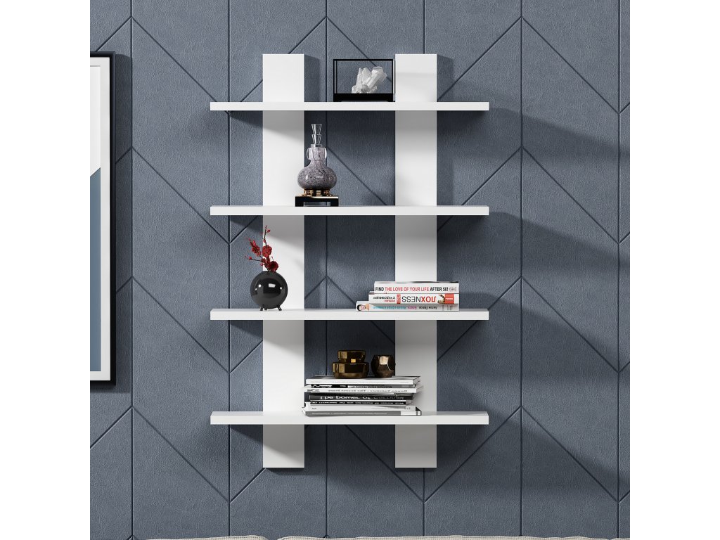 Bílá nástěnná police LAUREL je tvořena čtyřmi policemi, na které si můžete uložit jak knihy, tak i dekorativní předměty.