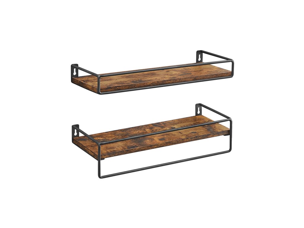 Dvojice polic v rustikální hnědé barvě s drátěnou konstrukcí a konzolí pro háčky.