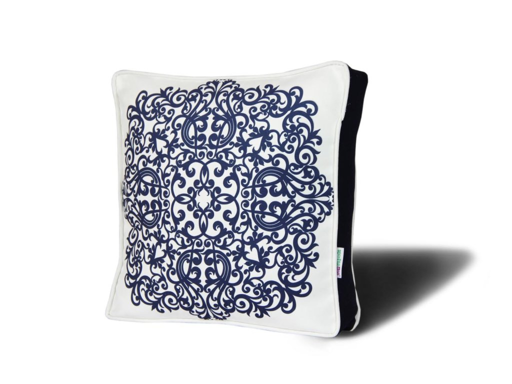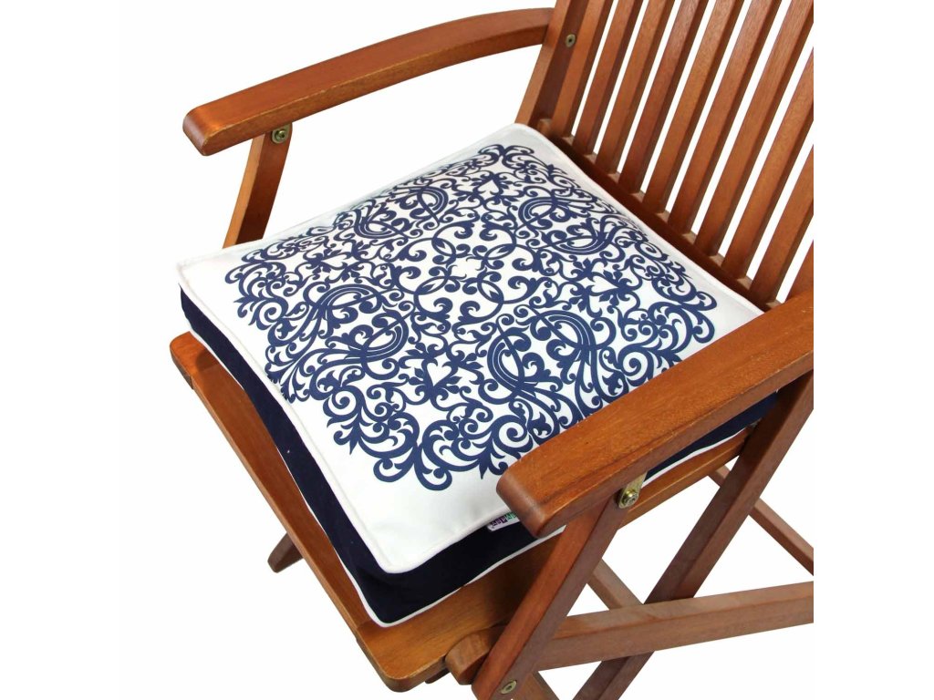 Pohodlný polštář na židle s lidovým vzorem v modré barvě.