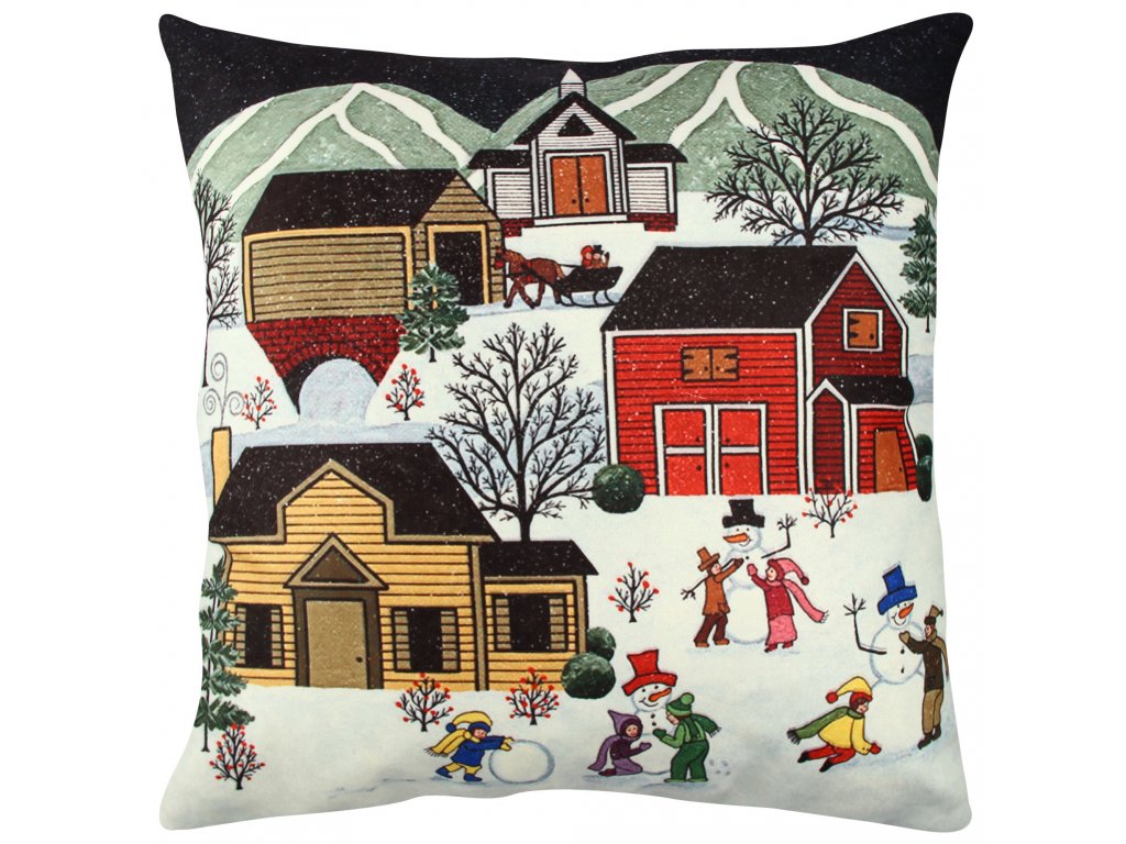 Dekorativní polštářek s motivem ZIMNÍ VESNICE.