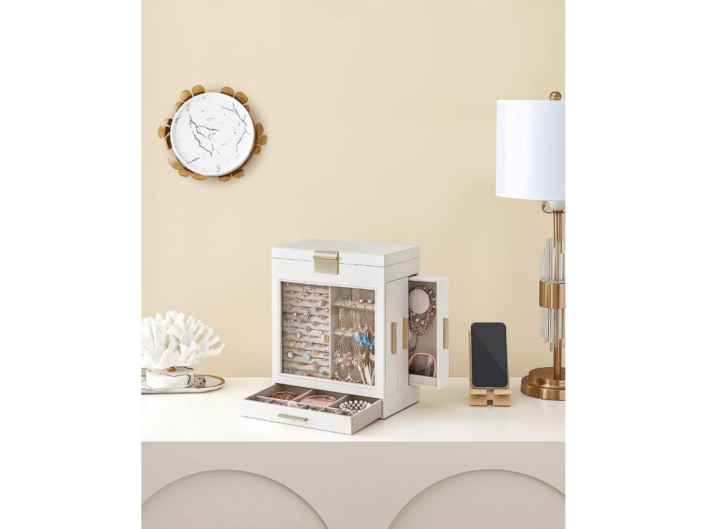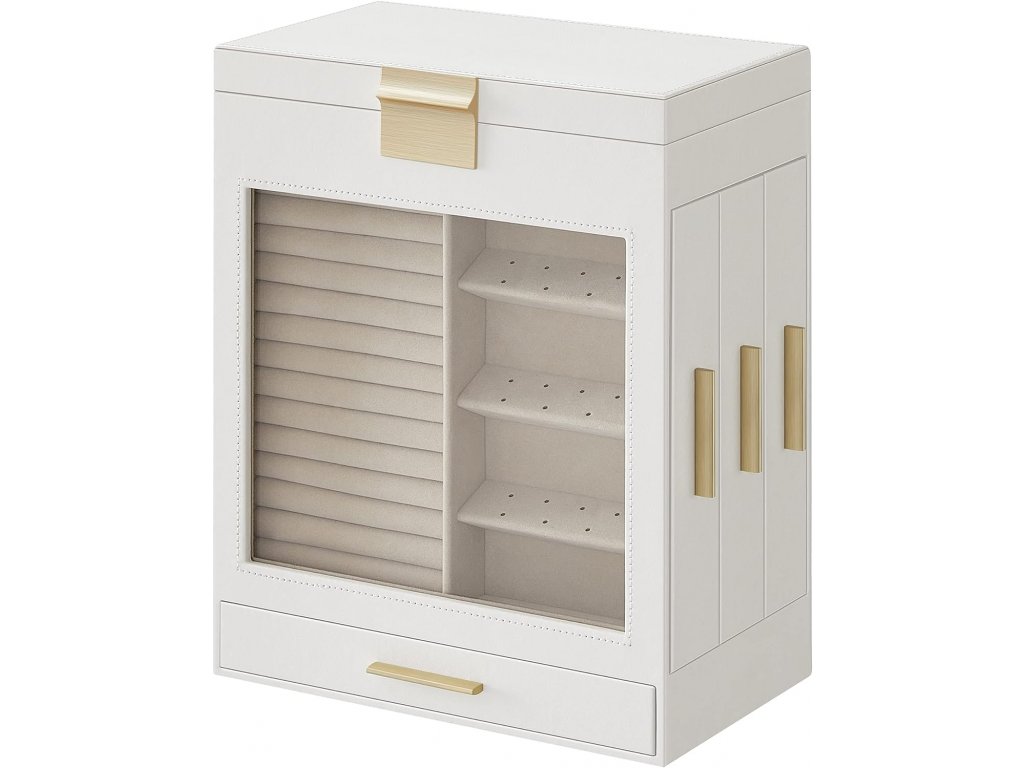 Elegantní kombinace bílé a zlaté, lehce se třpytící kovové úchyty, měkká sametová podšívka, úhledné prošívání, kvalitní PU, robustní MDF - tyto prvky dohromady tvoří elegantní a odolnou šperkovnici.