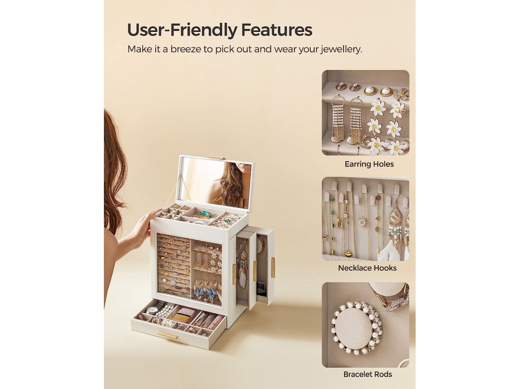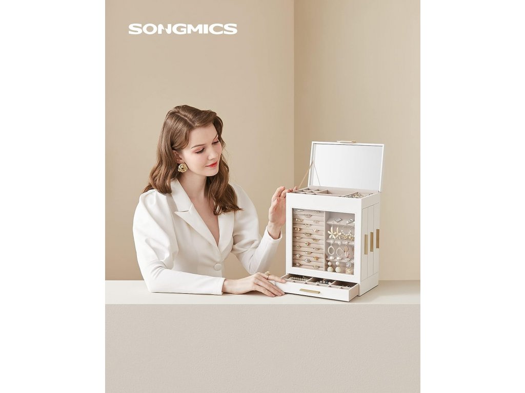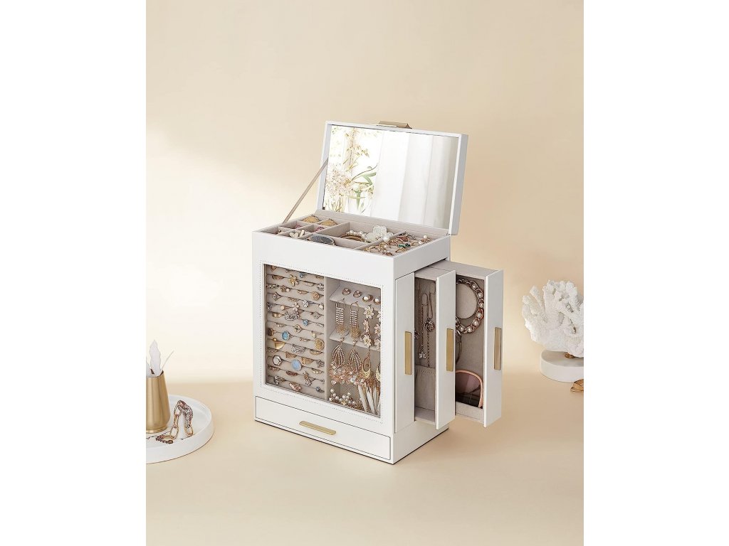 Šperkovnice je vybavena velkým zrcadlem na vnitřní straně víka, takže ráno můžete rychle zkontrolovat, jak vám vybrané šperky sluší.