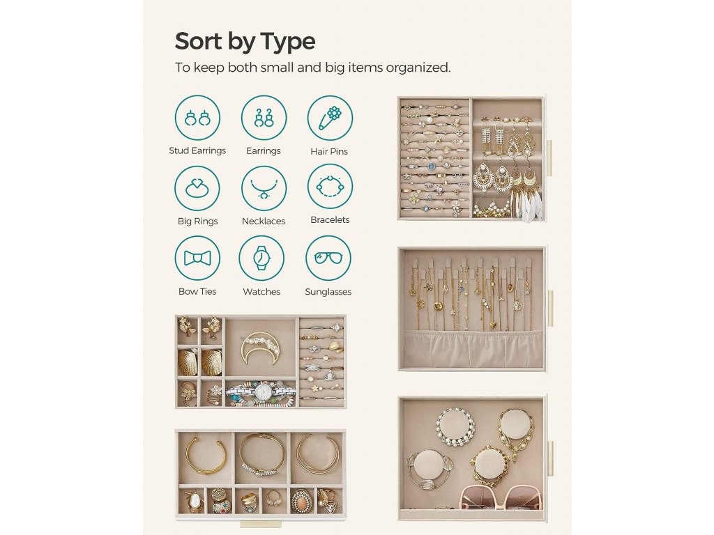 Přenosná šperkovnice v elegantní krémovo-zlaté kombinaci pro uložení a vystavení vašich šperků