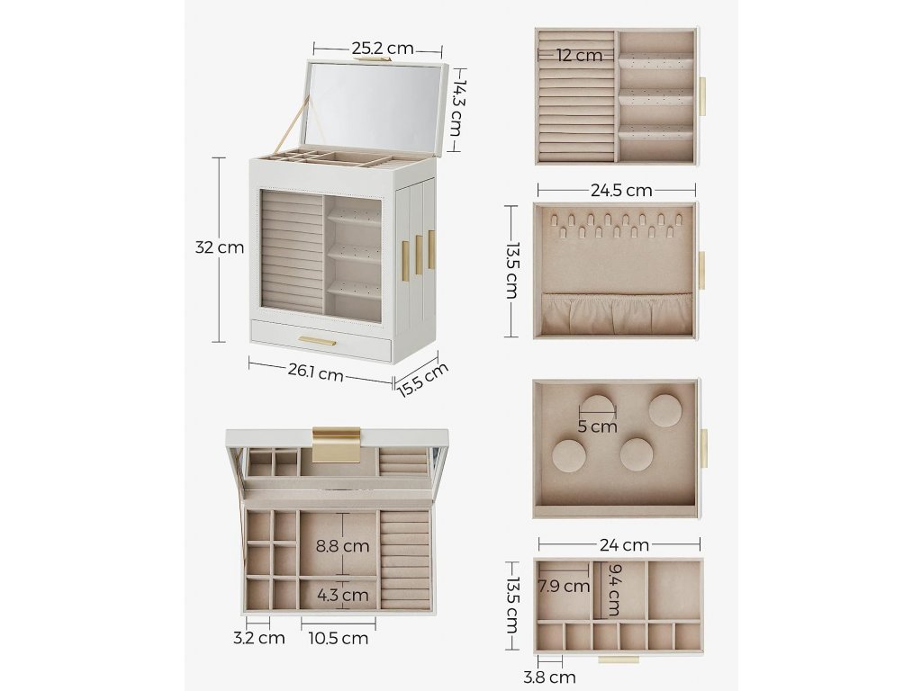 Šperkovnice má 3 zásuvky pro zavěšení náhrdelníků a náušnic - bez zamotávání - a pro uložení prstenů, náramků a hodinek. Horní patro a spodní vodorovná zásuvka pro brože, vlasové doplňky atd.