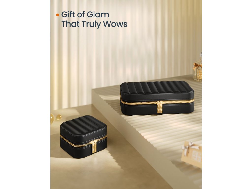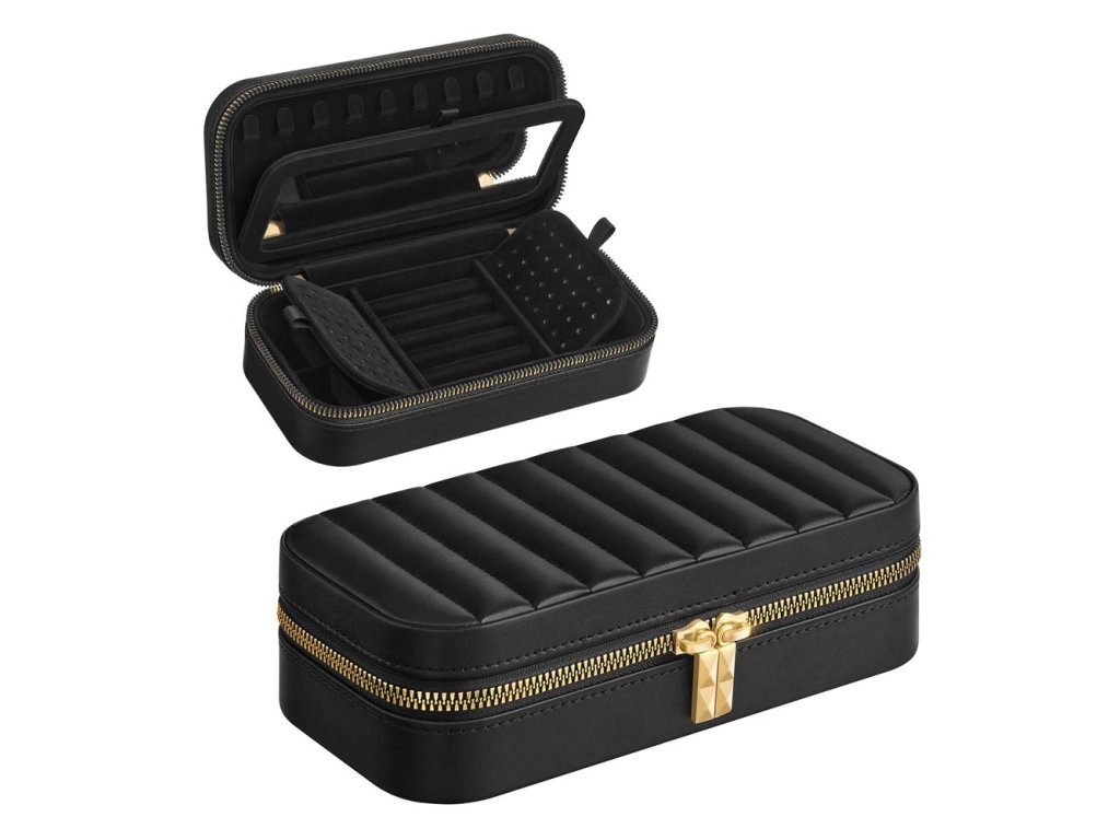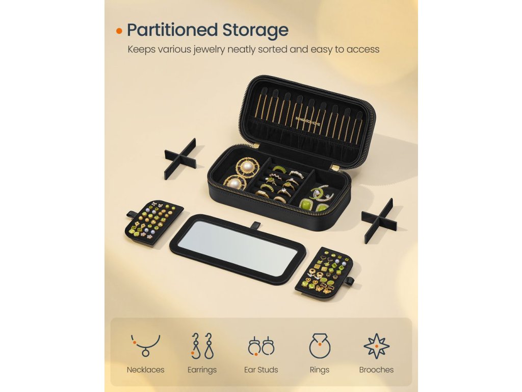 Díky nastavitelným přepážkám, přihrádkám na prsteny, vyhrazené části na náhrdelníky a 2 vyjímatelným deskám na náušnice vám tento malý kufřík na šperky zajistí, že vše dorazí tak hezky, jak jste si to zabalili - žádné zamotání, uzlíky nebo oděrky, a to ani během dlouhých cest.
