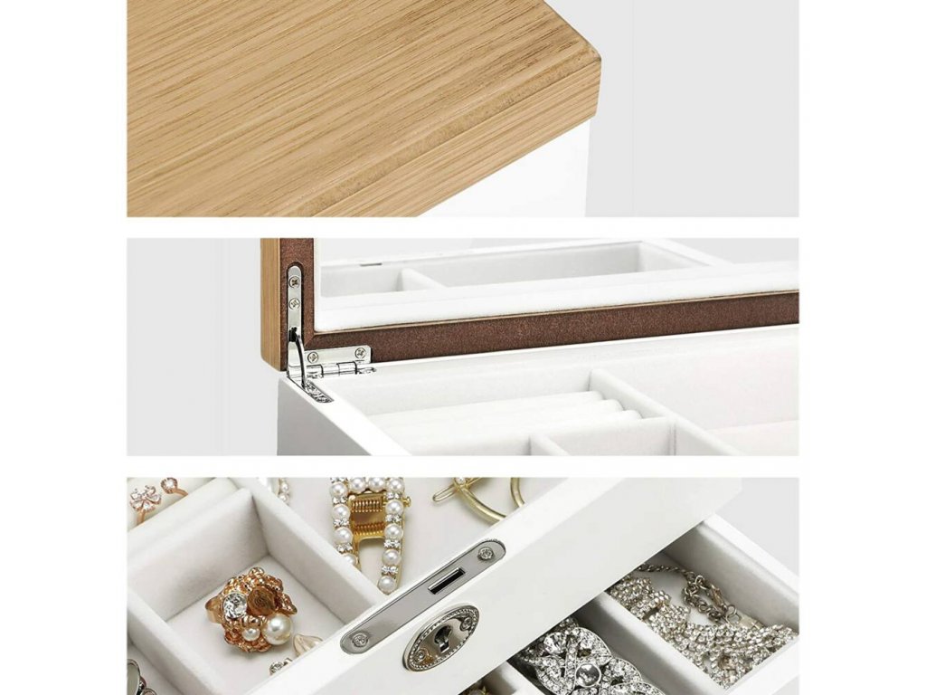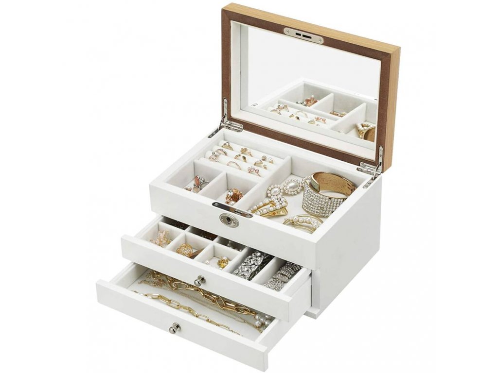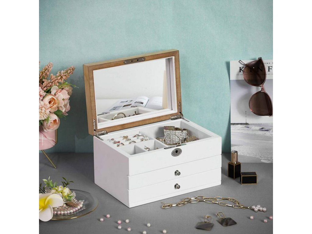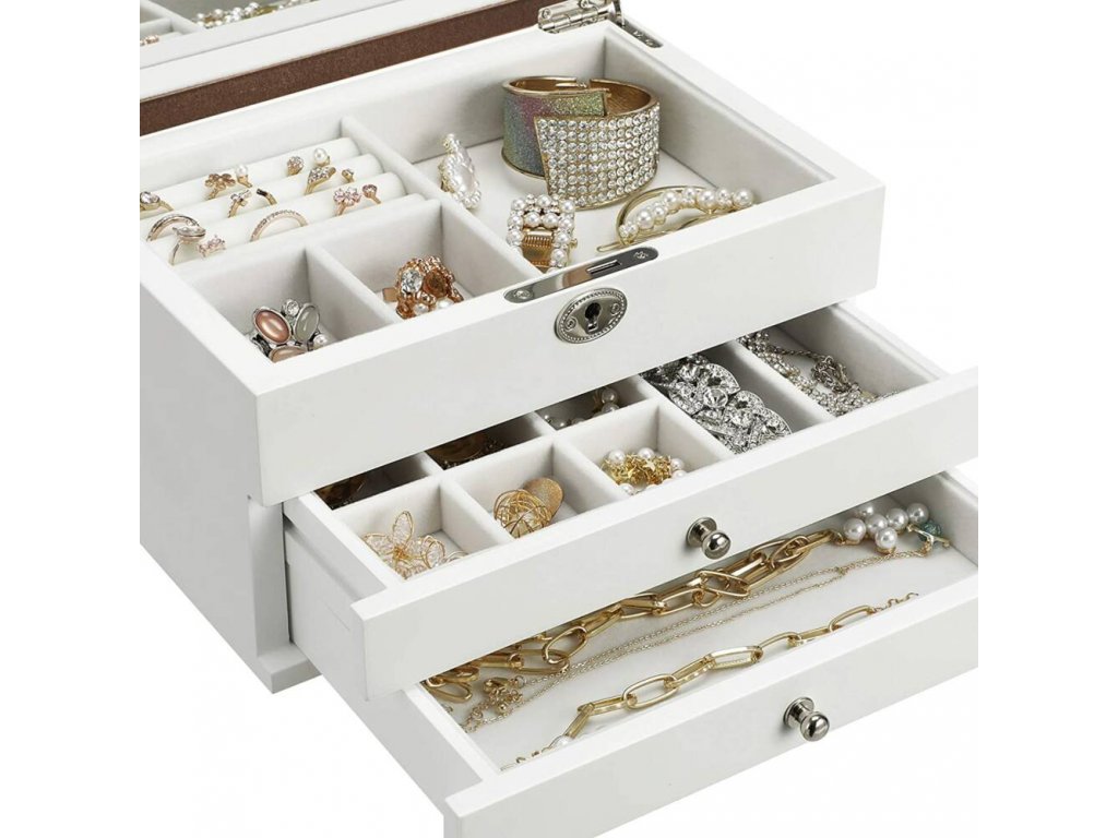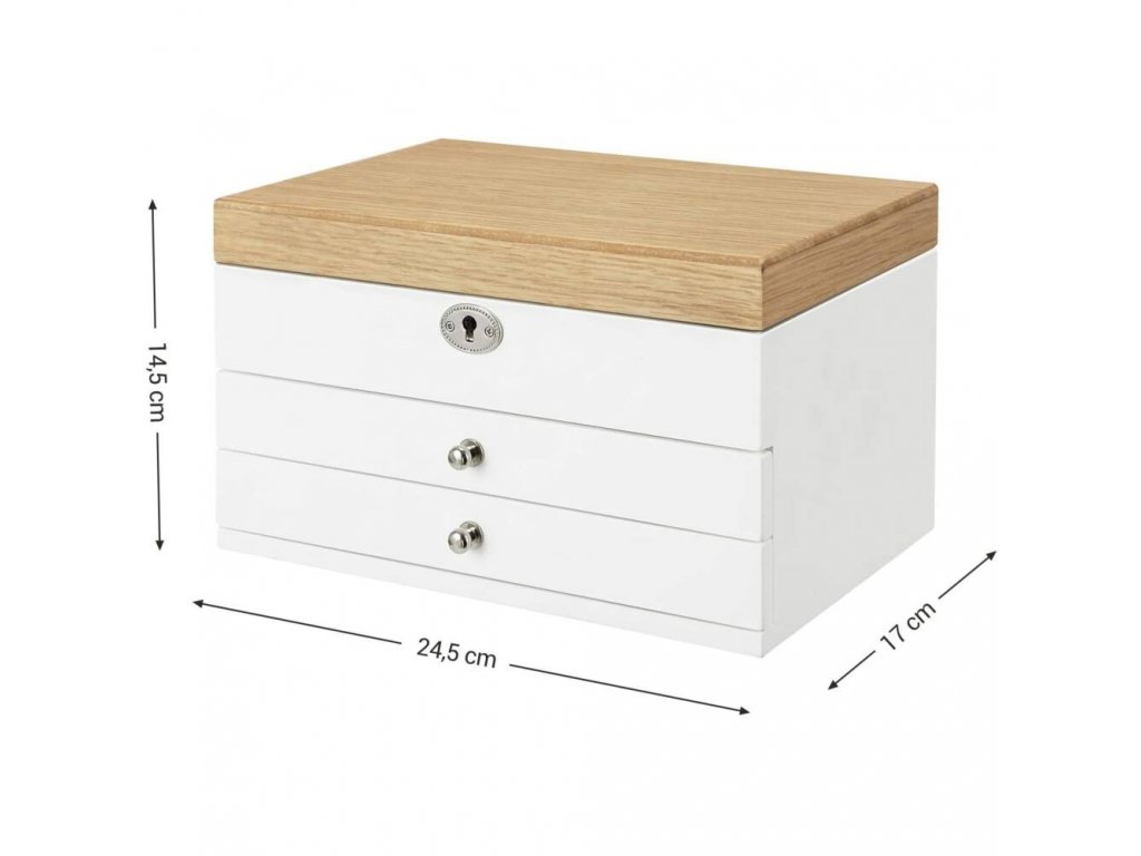 Bílá šperkovnice s dřevěným víkem je velice praktická, uzamykatelná a je sestavená ze tří jednotlivých zásuvek s přihrádkami i bez.
