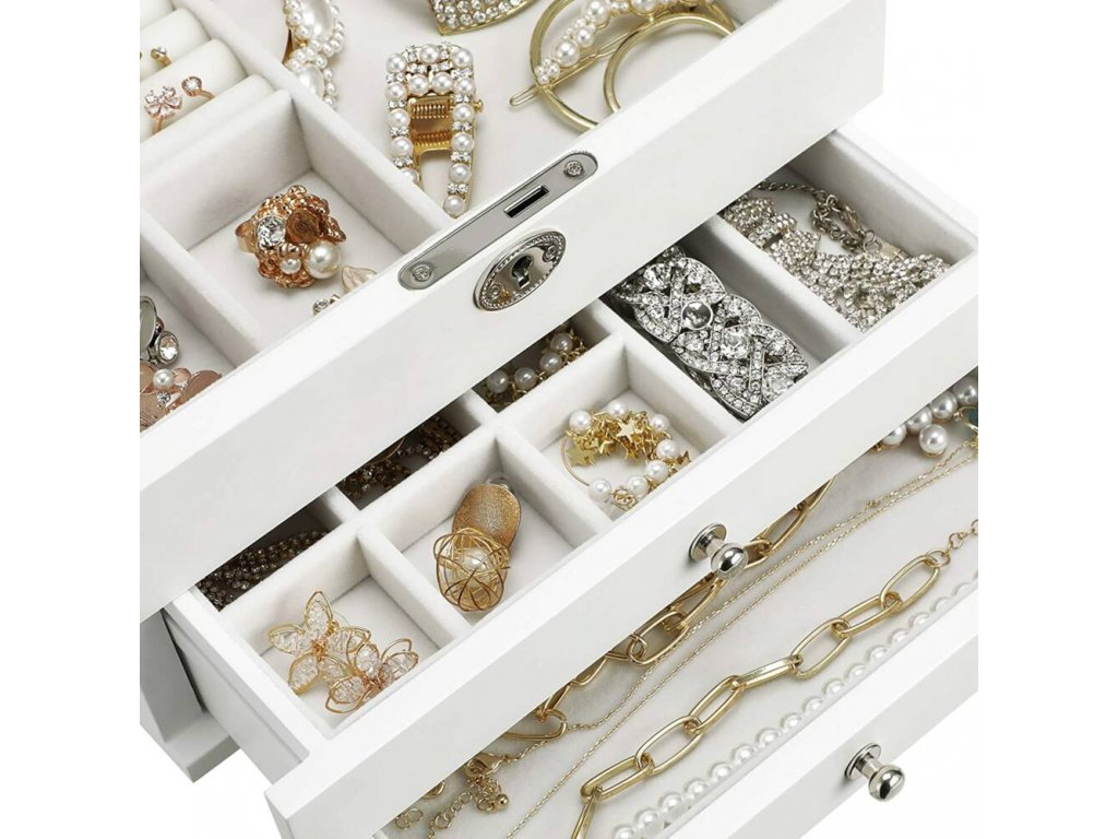 Bílá šperkovnice nabízí dvě zásuvky s pevnými přihrádkami například na prsteny a náušnice a spodní přihrádku na dlouhé korále, nebo brože.