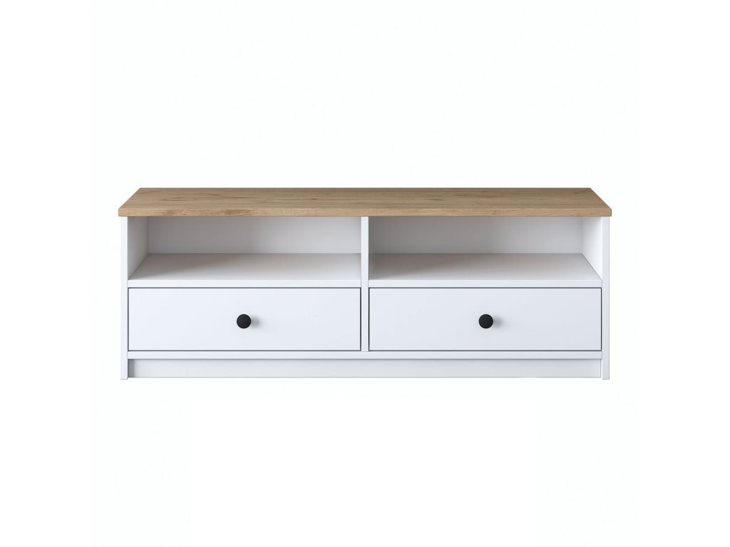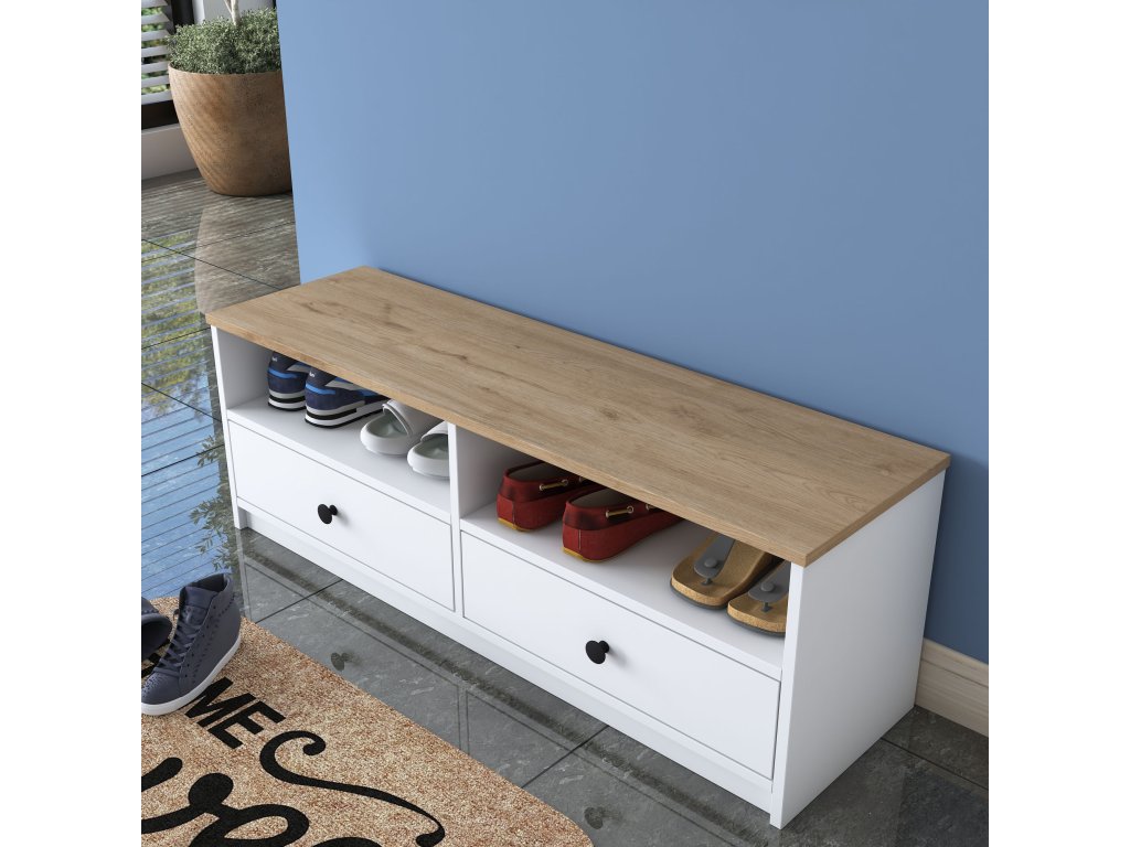 Bílý botník EB103 nabízí dvě spodní zásuvky s černými úchyty nad nimiž je prostor dvou regálů, které zakrývá odkládací nebo sedací plocha v dekoru ořech.