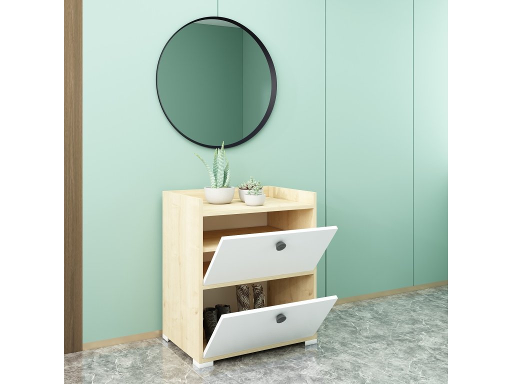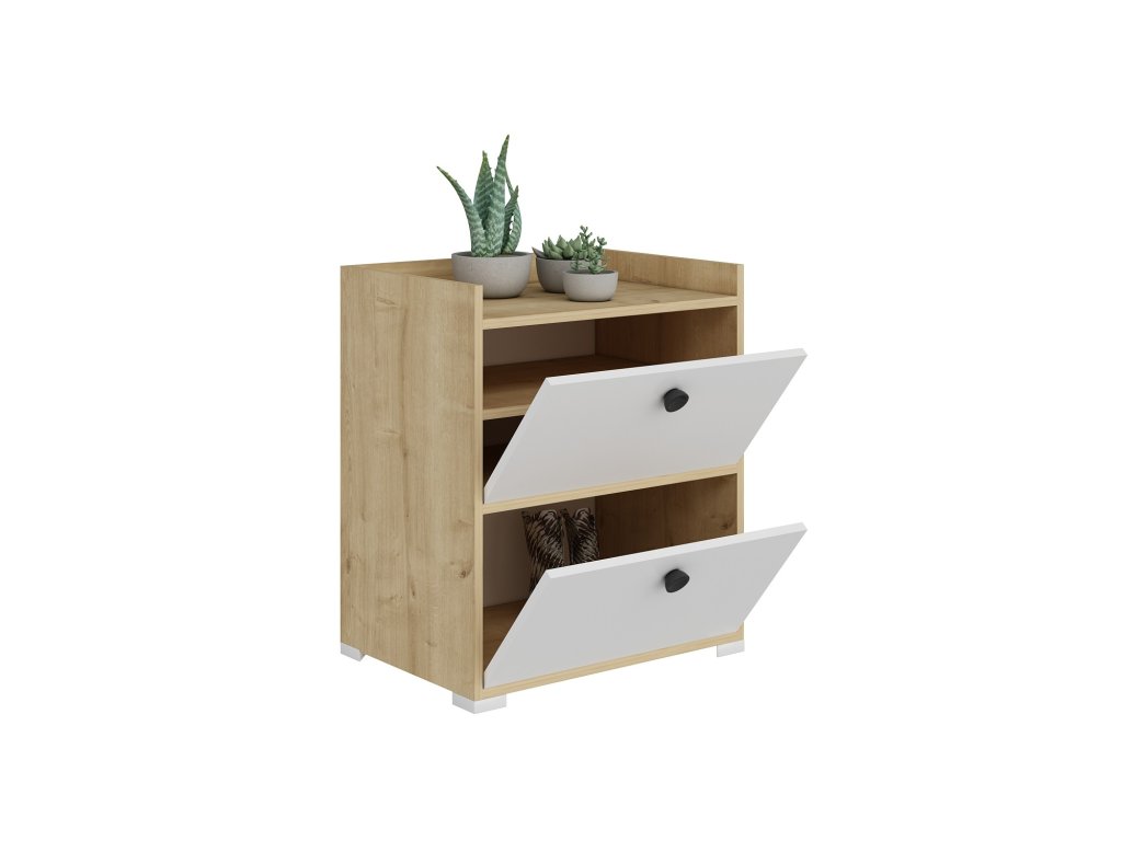 V dekoru dub sapphire s bílými výklopnými dvířky nabízí botník METE krom tří uzavřených regálů i ohraničenou odkládací desku.