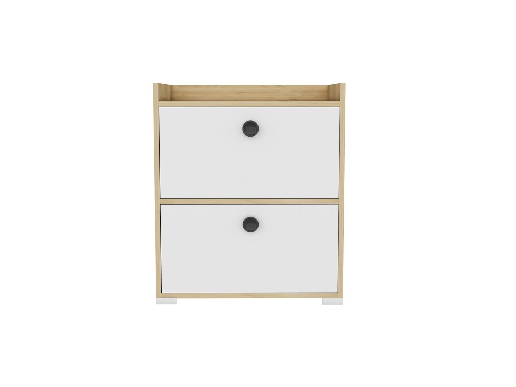 Je vyroben z 18 mm silných desek pokrytých 100 % melaminem v bílé barvě a v dekoru dub sapphire a z bílých nohou a tmavých drobných úchytů.