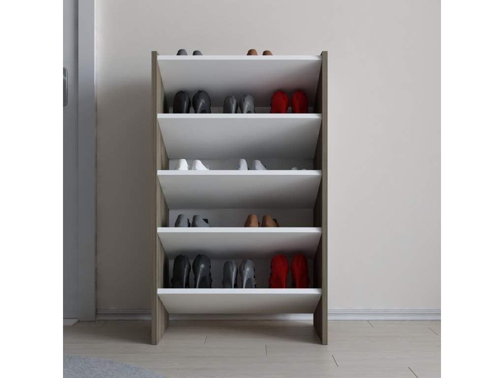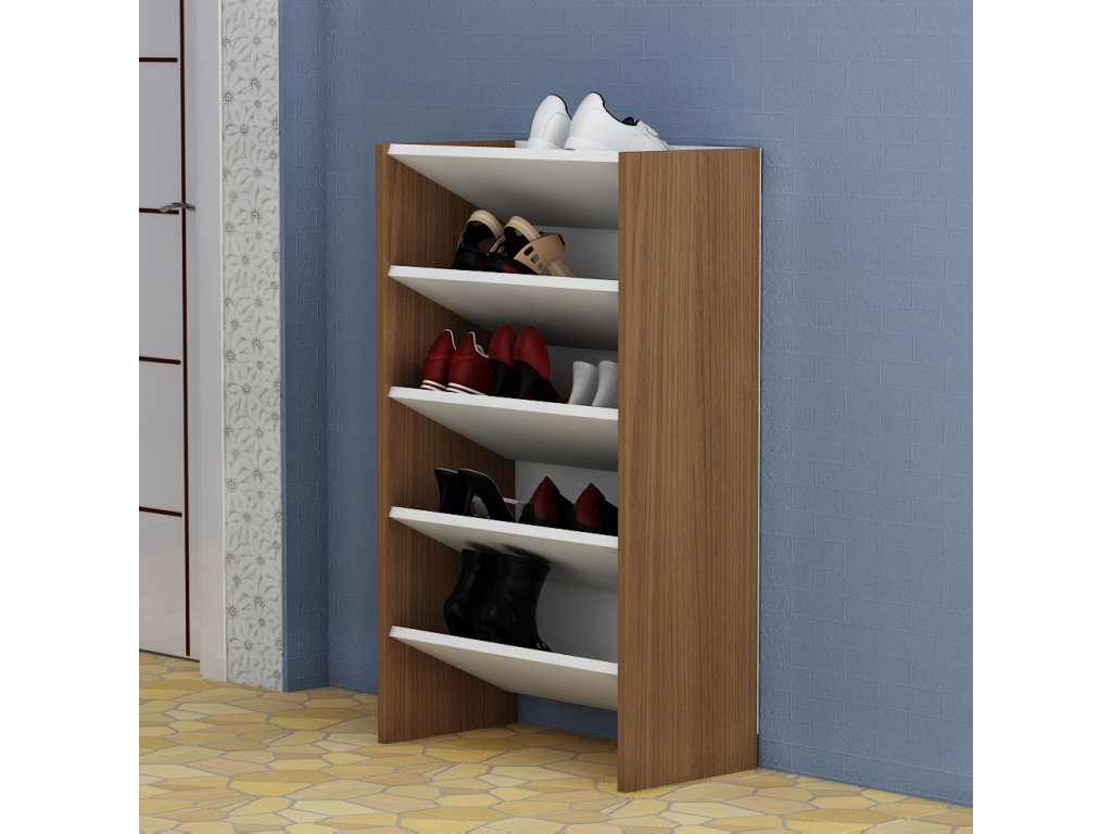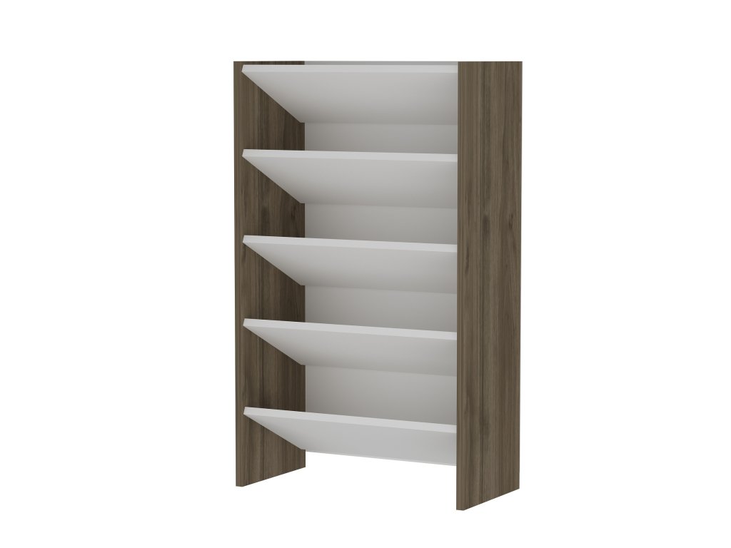 Botník NIL je vyrobený z v bočnic v dekoru ořech držících pět bílých naklopených regálů, jenž nabízejí úložný prostor pro Vaši obuv.