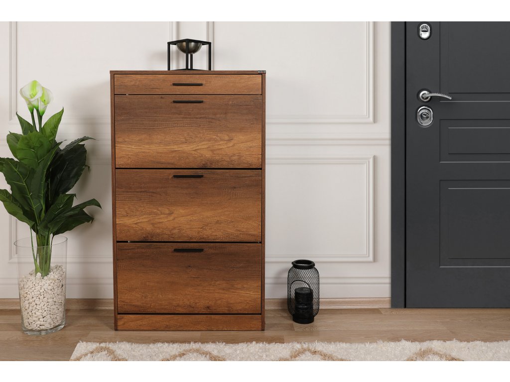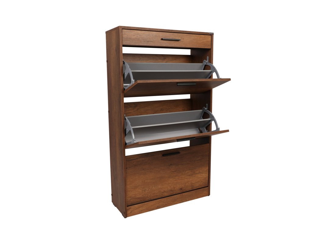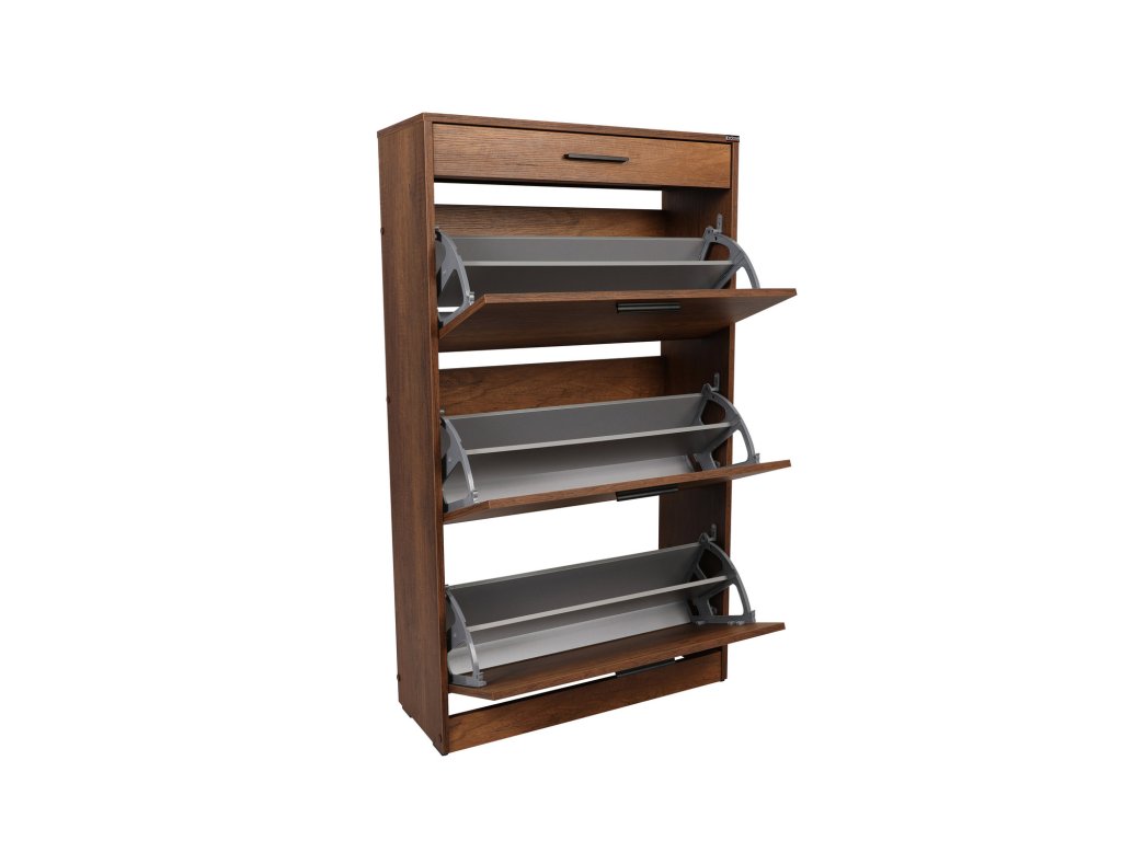 Praktický botník v dekoru tmavý ořech se třemi výklopnými zásuvkami na boty a jednou úzkou zásuvkou např. na klíče, pod hlavní deskou.