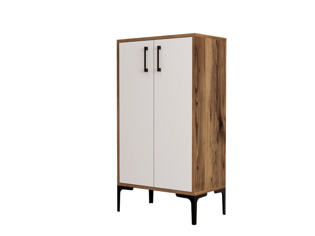 PRAG je v dekoru ořech vyrobený botník, jenž má police ukryté za bílými dvířky s velkými kovovými madly.