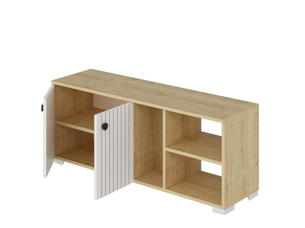Je vyroben z 18 mm silných desek pokrytých 100 % melaminem v dekoru dub sapphire a v bílé barvě.