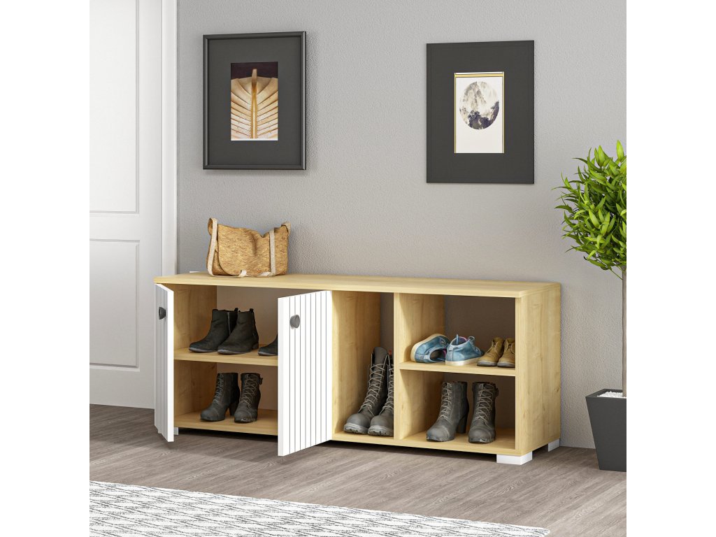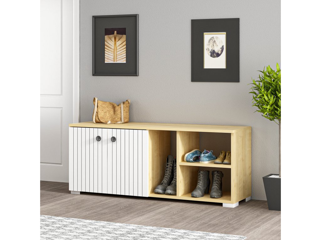 V dekoru dub sapphire a v bílé barvě vyrobený botník SARANDON Vám může být dobrým pomocníkem v předsíni, nebo i v šatně.