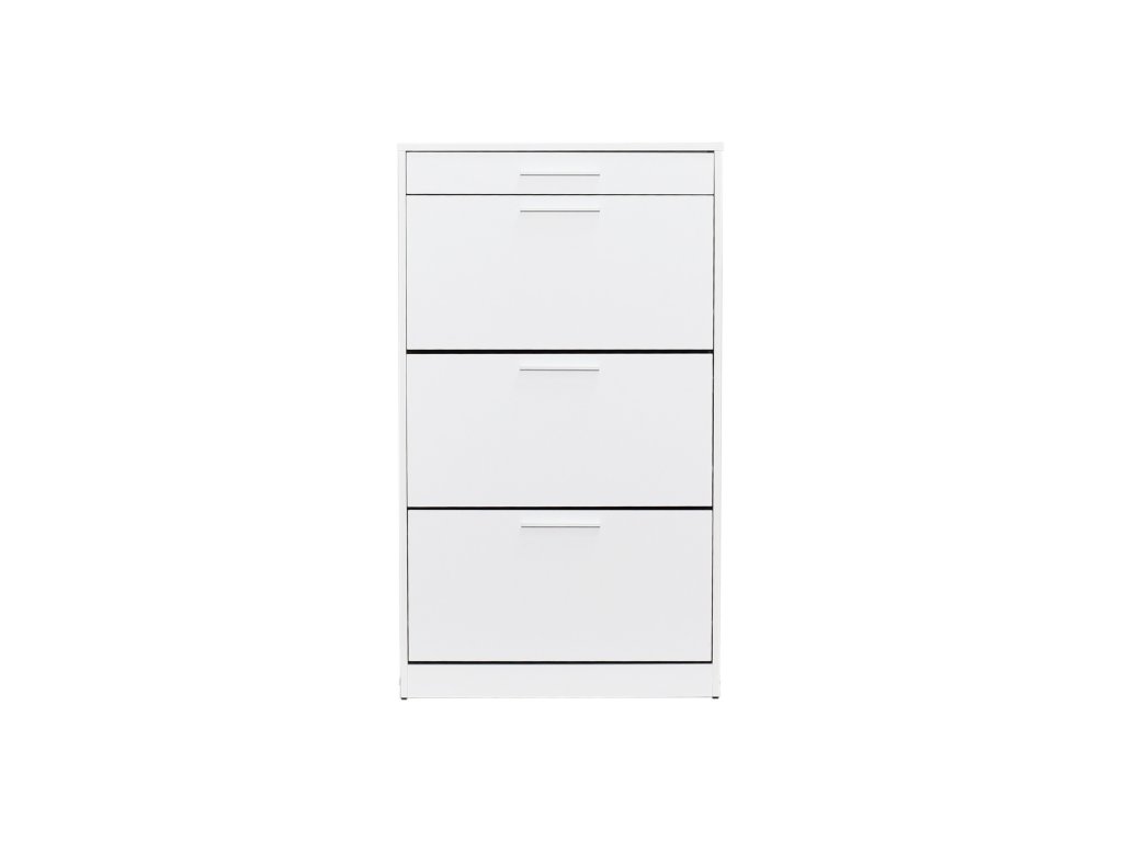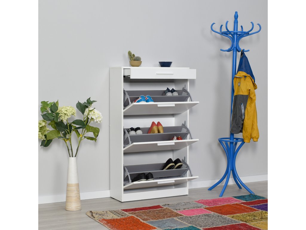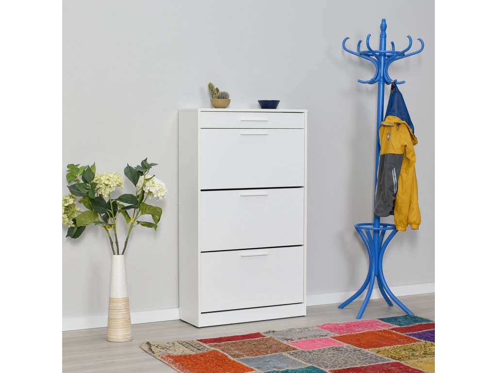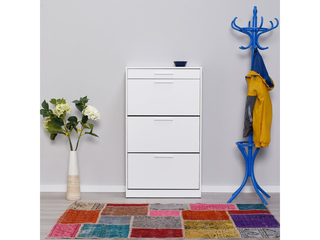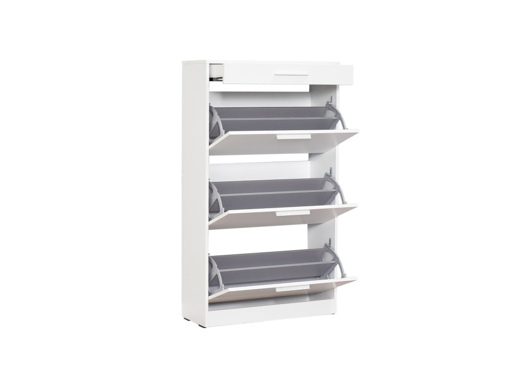 Bílý botník SHC431 nabízí tři výklopné regály pro boty a je doplněn ještě o malou horní zásuvku.