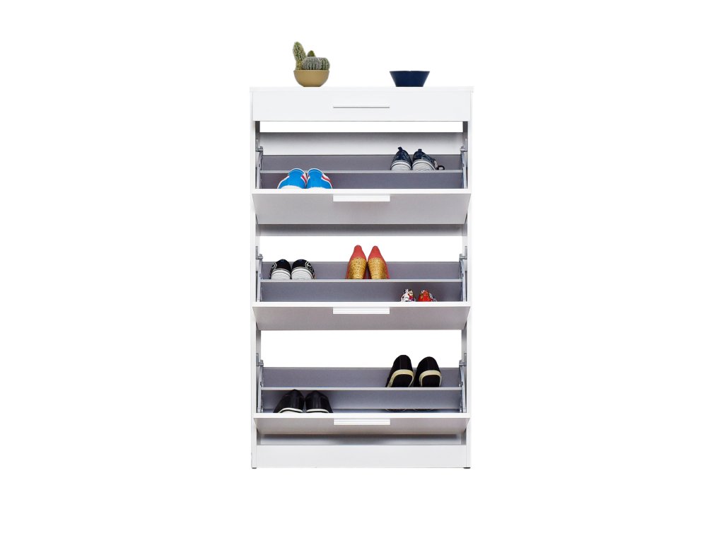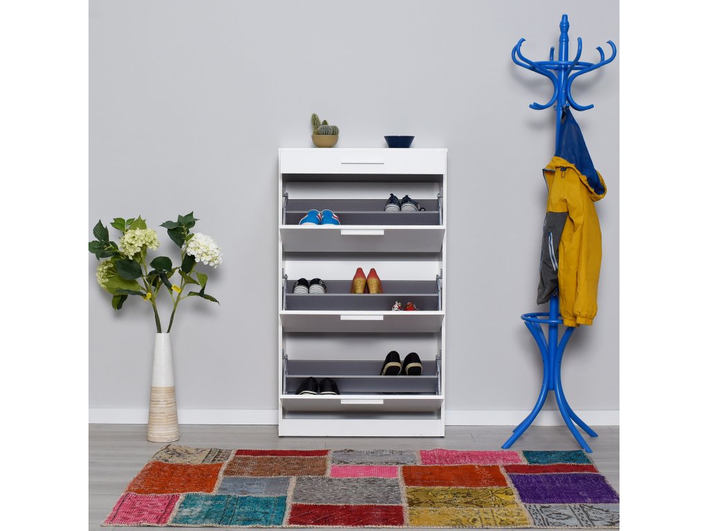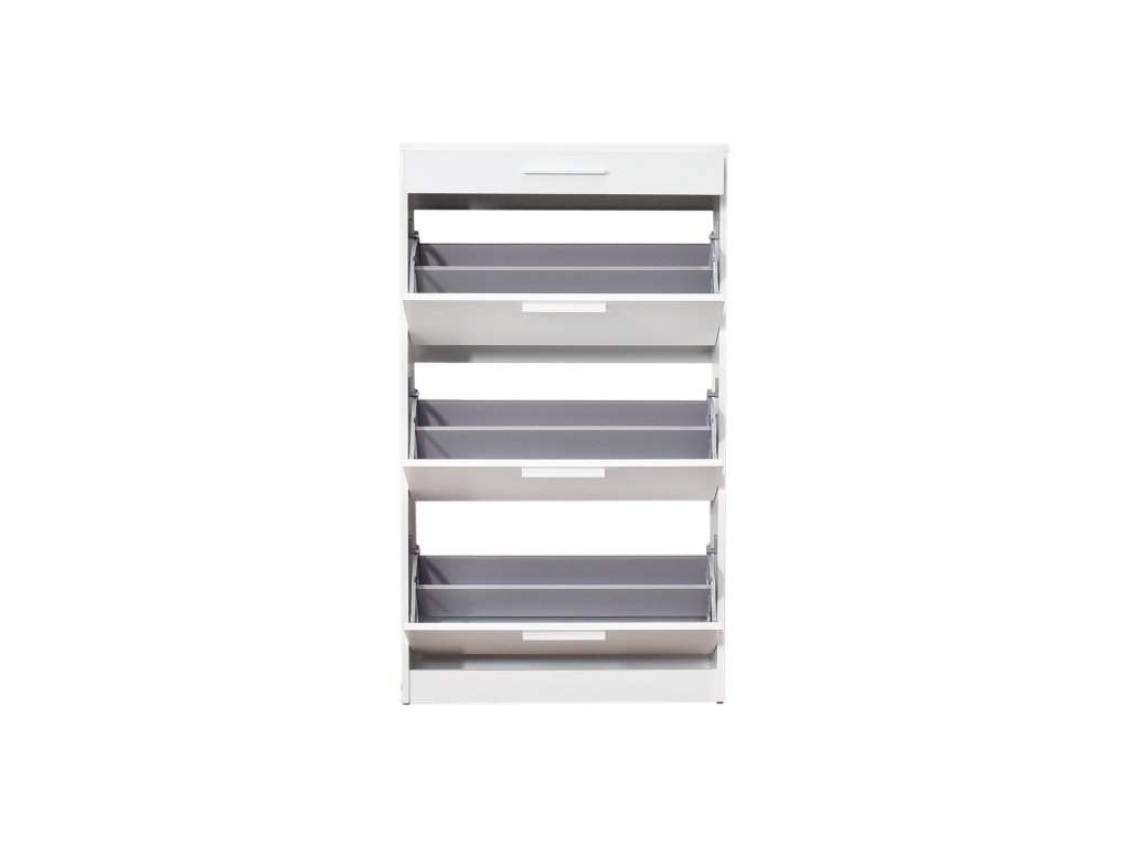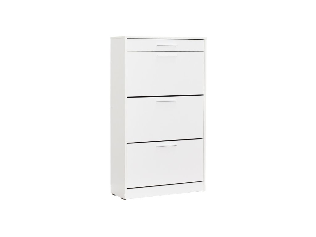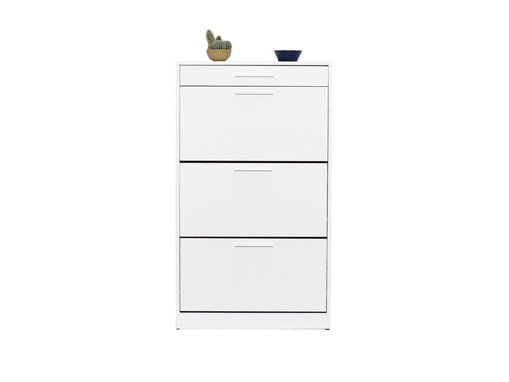 Bílý botník SHC431 nabízí tři výklopné regály pro boty a je doplněn ještě o malou horní zásuvku.