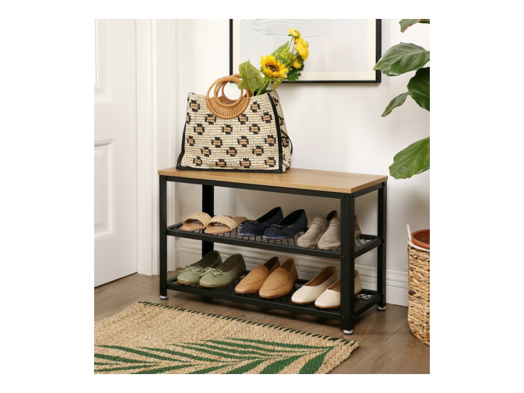 Lavička s deskou v dekoru světlého dřeva, se 2 policemi z černé síťoviny - praktický nábytek pro vaši předsíň, v trendy průmyslovém stylu