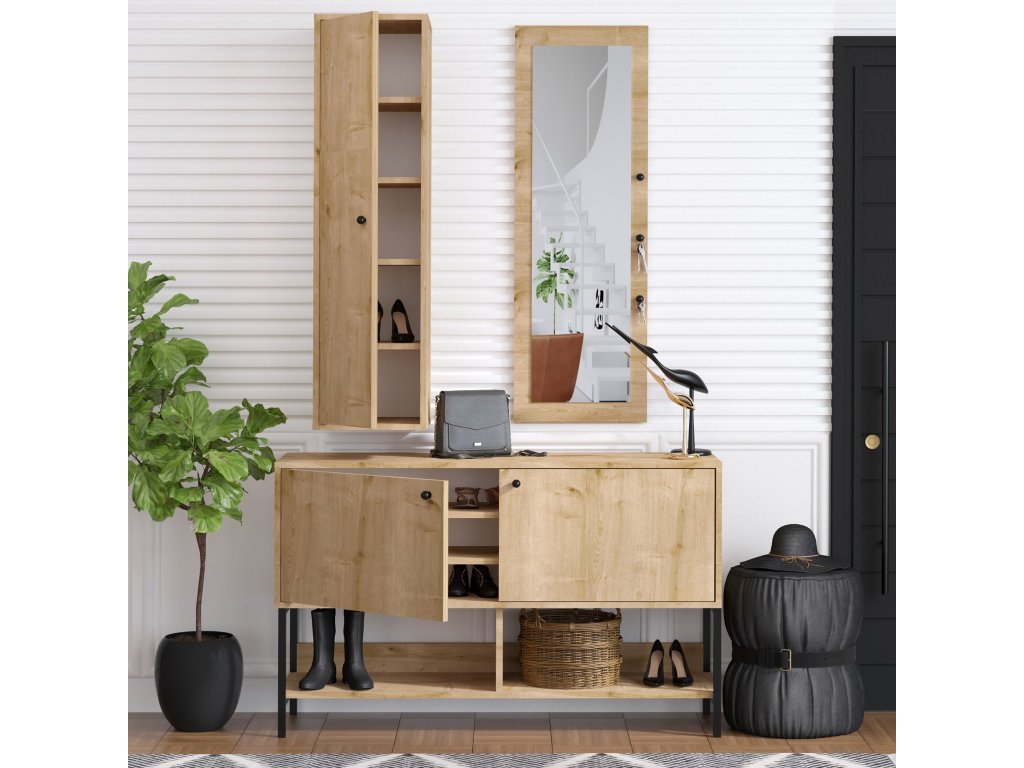 Předsíňová stěna CHUMO je úžasnou kombinací třídílného předsíňového praktického nábytku a dekorativního prvku v barvách dub sapphire.