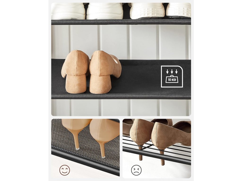 Dvě police z odolné polyesterové tkaniny si poradí se všemi typy bot včetně vysokých podpatků. Dejte sbohem snaze najít v moři bot ten správný pár - náš regál vám usnadní jejich přehledné uspořádání.