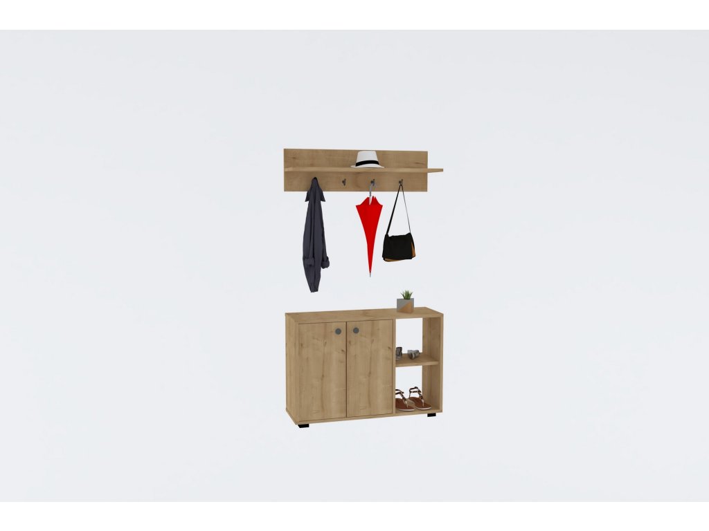 Předsíňová stěna VENOM je vyrobená v dekoru dub sapphire a nabízí uzavíratelný botník s bočním regálem a nástěnnou polici s háčky.