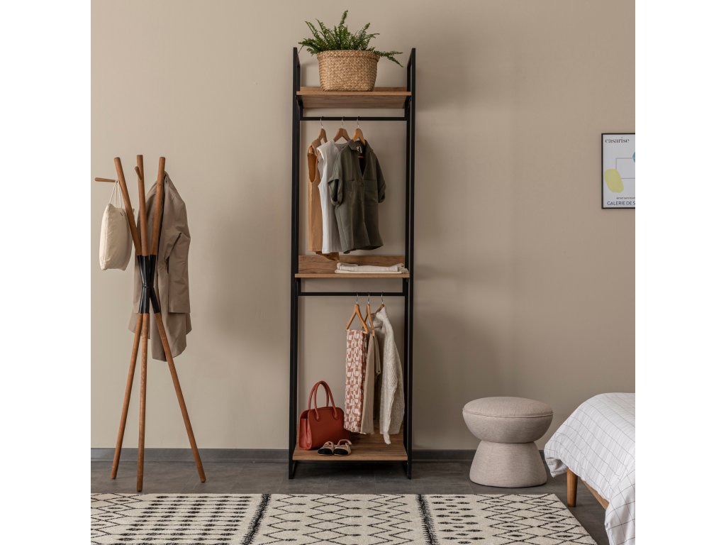 V černé kovové konstrukci šatní skříně DYNAMIC jsou v různých výškách usazené tři otevřené police nabízející úložný prostor v industriálním stylu.