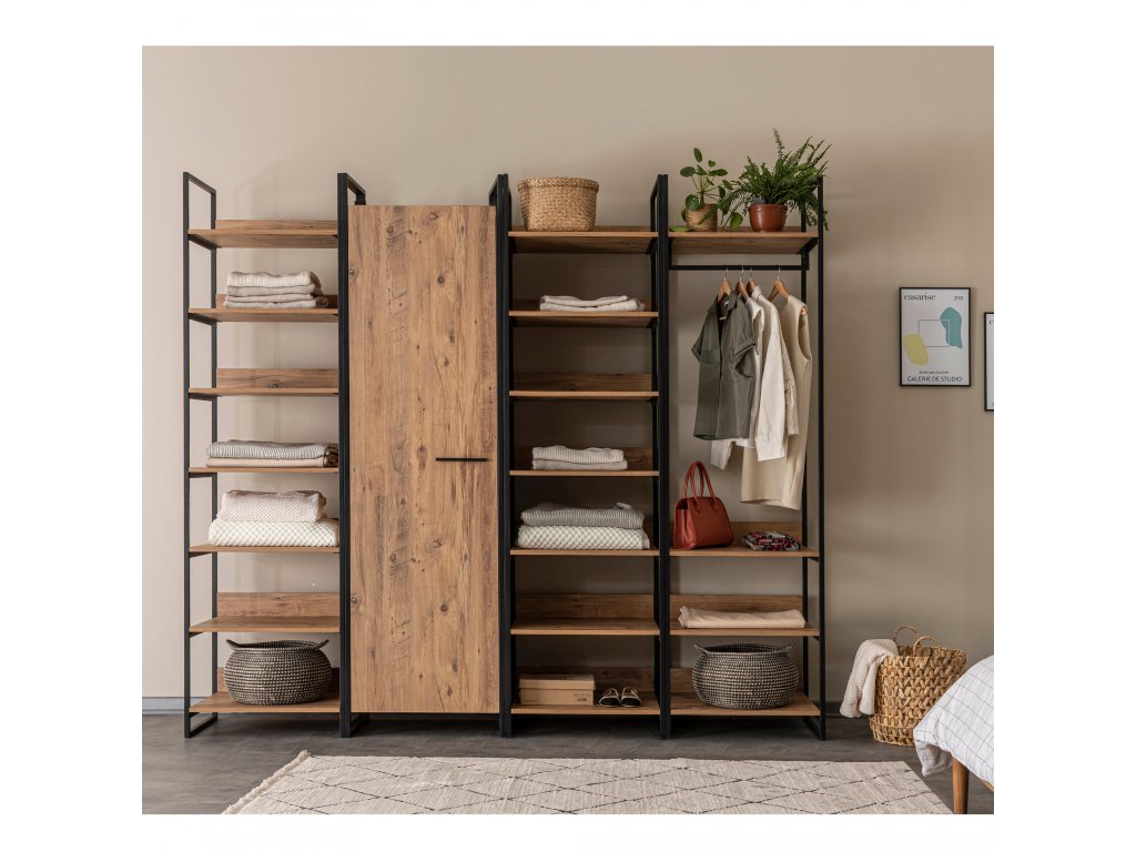 Čtyřdílná šatní skříň DYNAMIC je skvělým způsobem řešená skříň vyrobená z černých kovových konstrukcí a desek v dekoru borovice atlantic.
