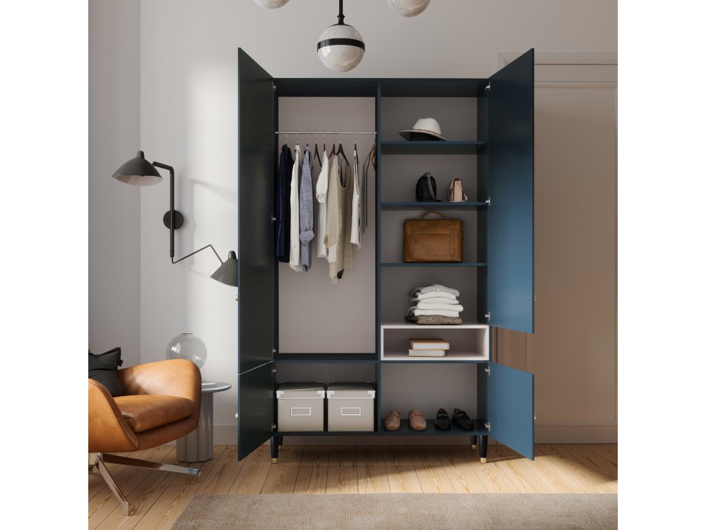 Šatní skřín INCLUDO je vynikajícím řešením pro ukládání a doplnění interiéru vašeho prostoru. Výška nohou měří 15 cm, což zajišťuje stabilitu a usnadňuje úklid pod skříní. Použité materiály zajišťují nejen funkčnost, ale také estetický vzhled nábytku. Povrchová úprava zásuvek zahrnuje PVC lemování, které nejenže dodává nábytku eleganci, ale také chrání hrany před poškozením.
