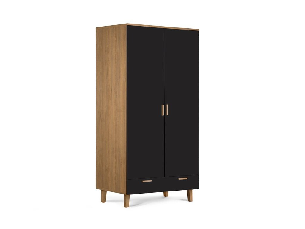 Prostorná a pevná šatní skříň z kolekce FRISK v kombinaci černé přírodního dubu. Kvalitní lamino a pojezdy zaručují dlouhodobé bezproblémové použití.