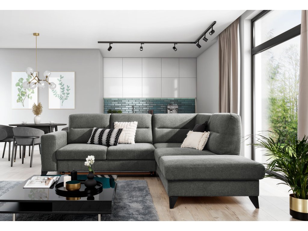 Rohová sedací souprava je vybavena mechanismem rozkládání typu DL s plochou na spaní 215x130 cm a úložným prostorem na lůžkoviny.