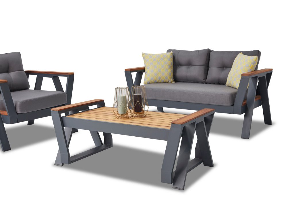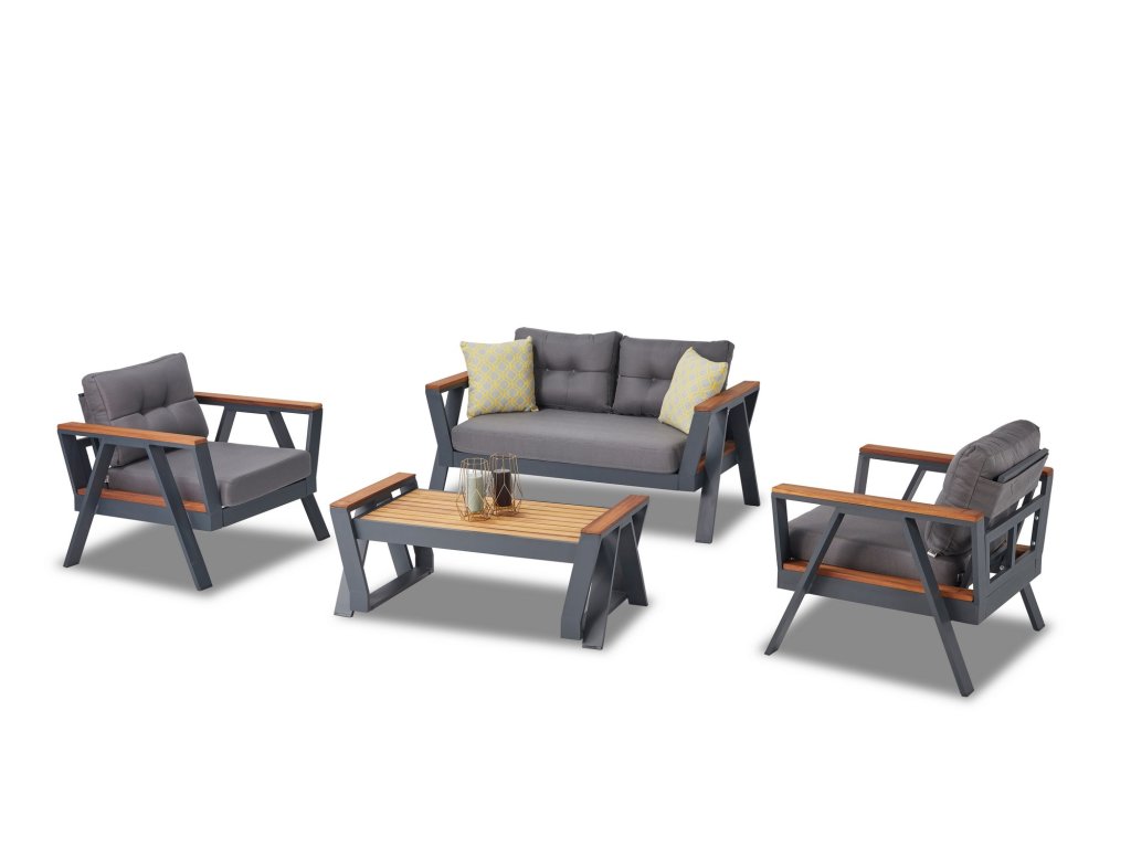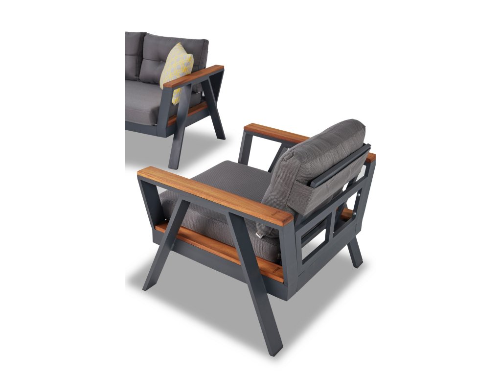 Materiál: dřevo, hliníková konstrukce, 28 DNS pěna - výplň polštářů a sedáků, akrylová tkanina, snadno čistitelná