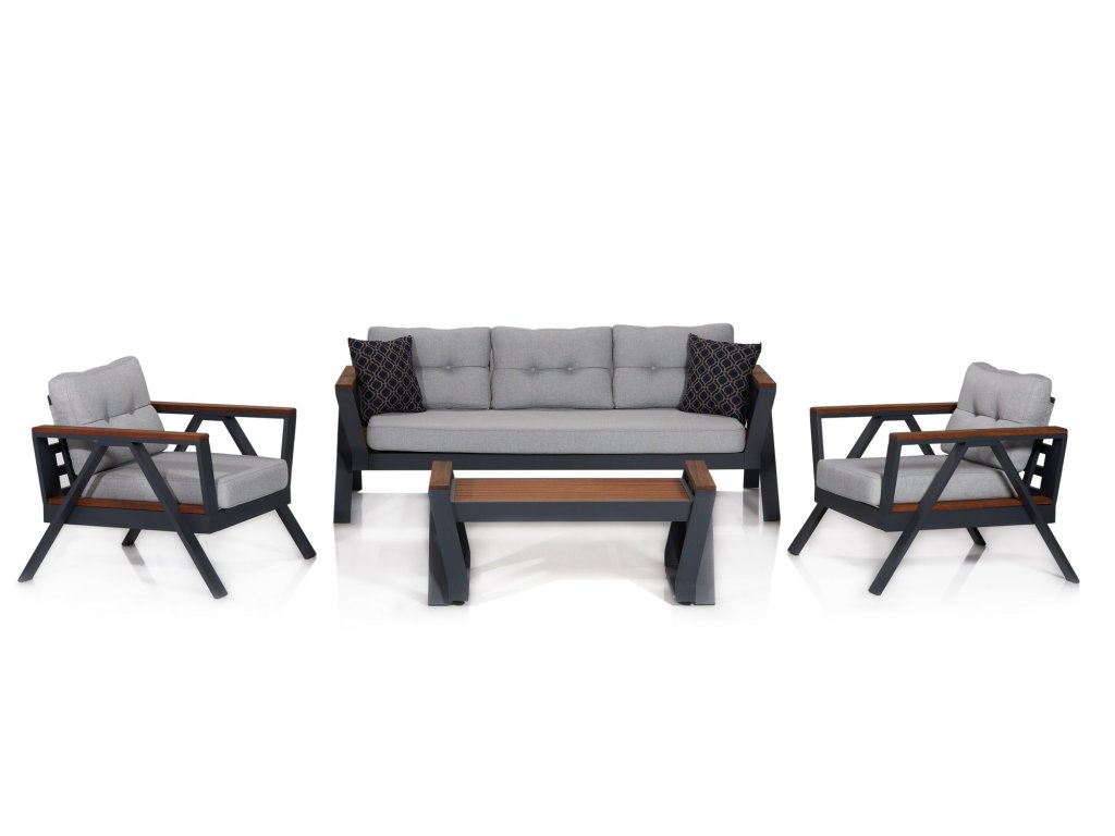 Materiál: dřevo, hliníková konstrukce, 28 DNS pěna - výplň polštářů a sedáků, akrylová tkanina, snadno čistitelná