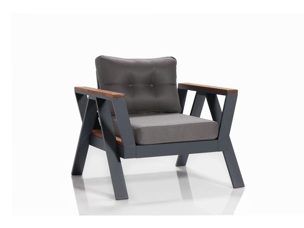 Je vyroben z hliníkových rámů, z 28 DNS pěny, z Iriko dřeva a z akrylové tkaniny.