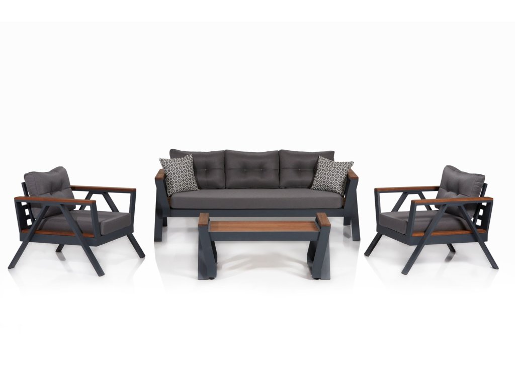 Sestava zahradního nábytku ATLAS je složená ze třímístné pohovky, dvou křesel a konferenčního stolku v kombinaci šedé a černé barvy.