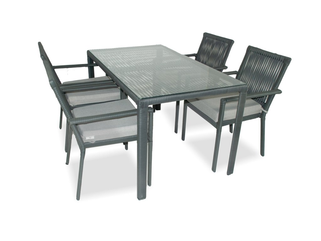 Šedá sestava zahradního nábytku LEROS 140 je moderní a designově propracovaný stůl se čtyřmi židlemi.