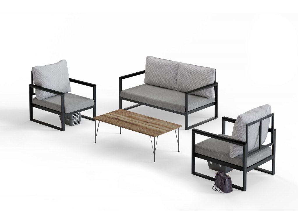Šedo-antracitová sestava zahradního nábytku MTLKNP002 je složená z dvoumístné pohovky, dvou křesel a z designového konferenčního stolku.
