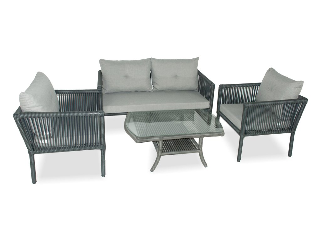 Šedá sestava zahradního nábytku SHANGAI 38 je moderní a designově vyplétaný stůl se dvěma křesly a jednou dvoumístnou sedačkou.