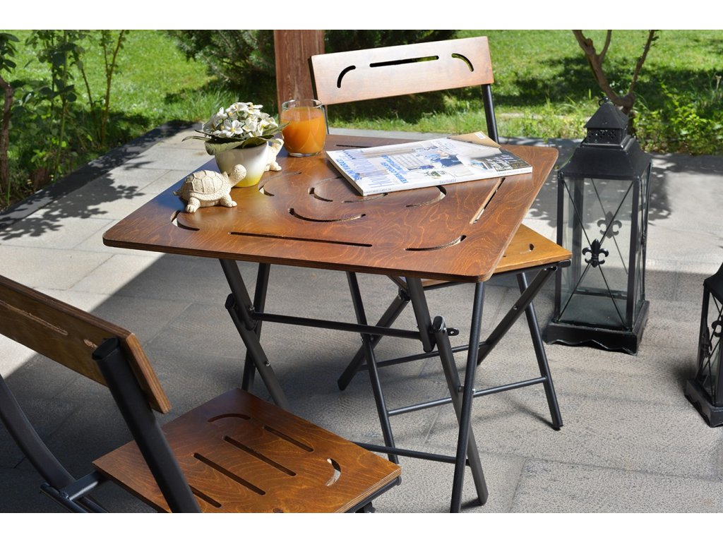 Set zahradního nábytku s deskou stolu a sedací částí židle vyrobenou z březového dřeva s elegantním hnědým nátěrem