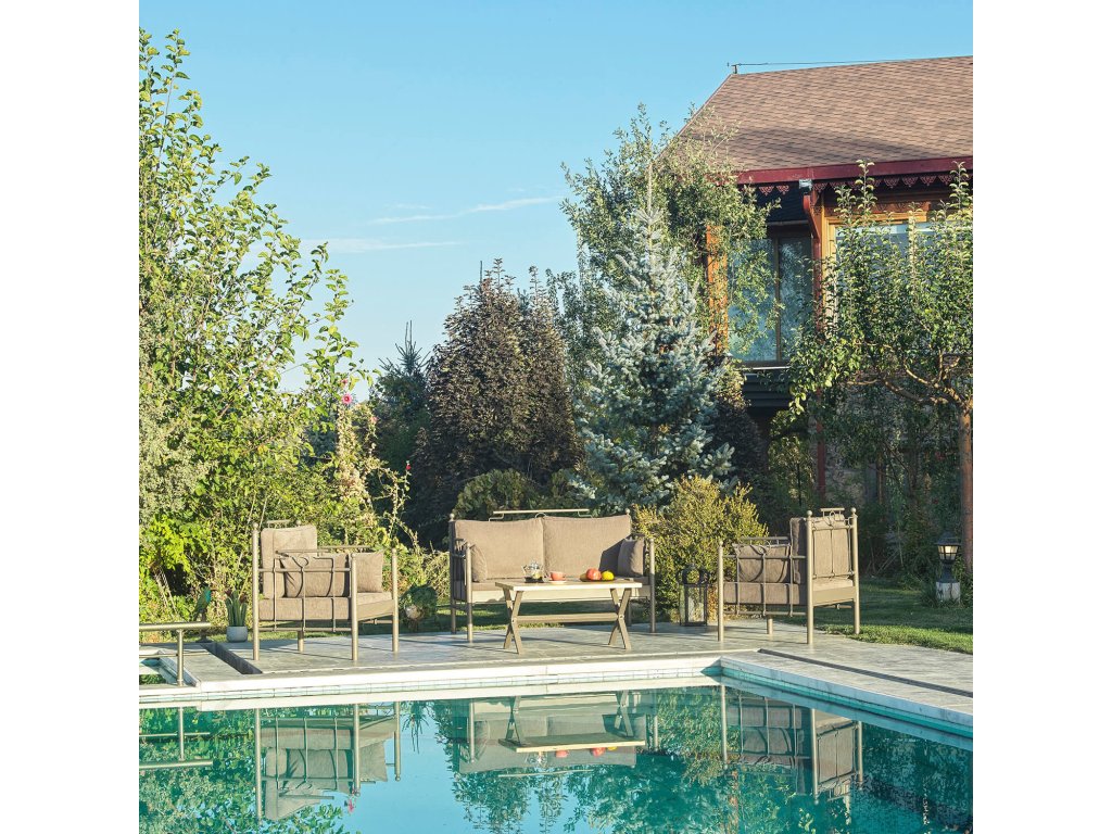 Zahradní nábytek HATKUS obsahující pohovku, dvě křesla s pohodlným polstrováním a konferenční stolek
