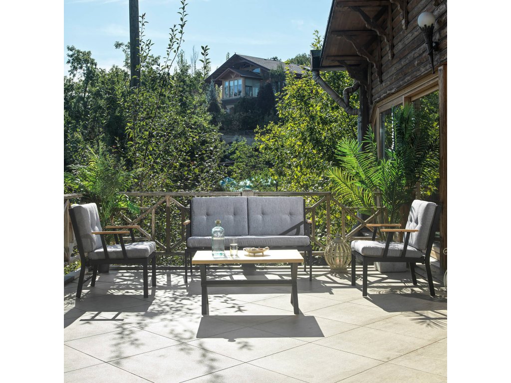 Sestava kovového, skládacího, zahradního nábytku LOTUS s pohodlným polstrováním obsahuje dvoumístnou pohovku, dvě křesla a konferenční stolek.