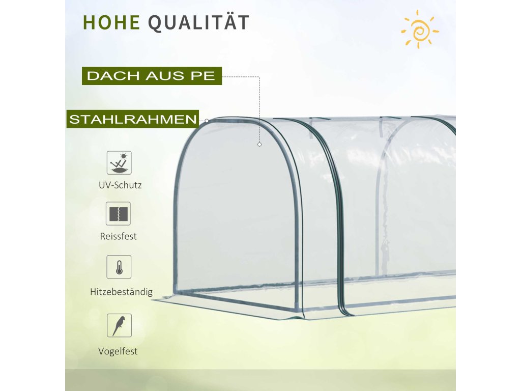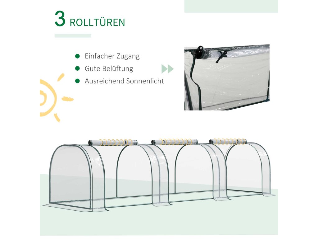 Užívejte si zahradu po celý rok! Díky rolovacím dveřím zajistí skleník Outsunny vašim rostlinám příjemnou teplotu, světlo a dostatek vláhy. Tento robustní fóliový skleník lze v případě potřeby rychle a snadno postavit a po skončení pěstování opět demontovat. Vaše rostliny jsou chráněny před chladem, deštěm, kroupami, větrem a intenzivním slunečním zářením. Díky průhlednému chladicímu rámu můžete mít své rostliny neustále pod dohledem.