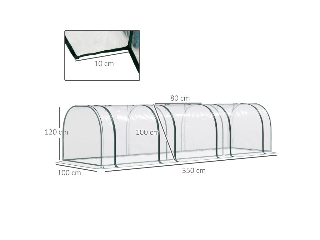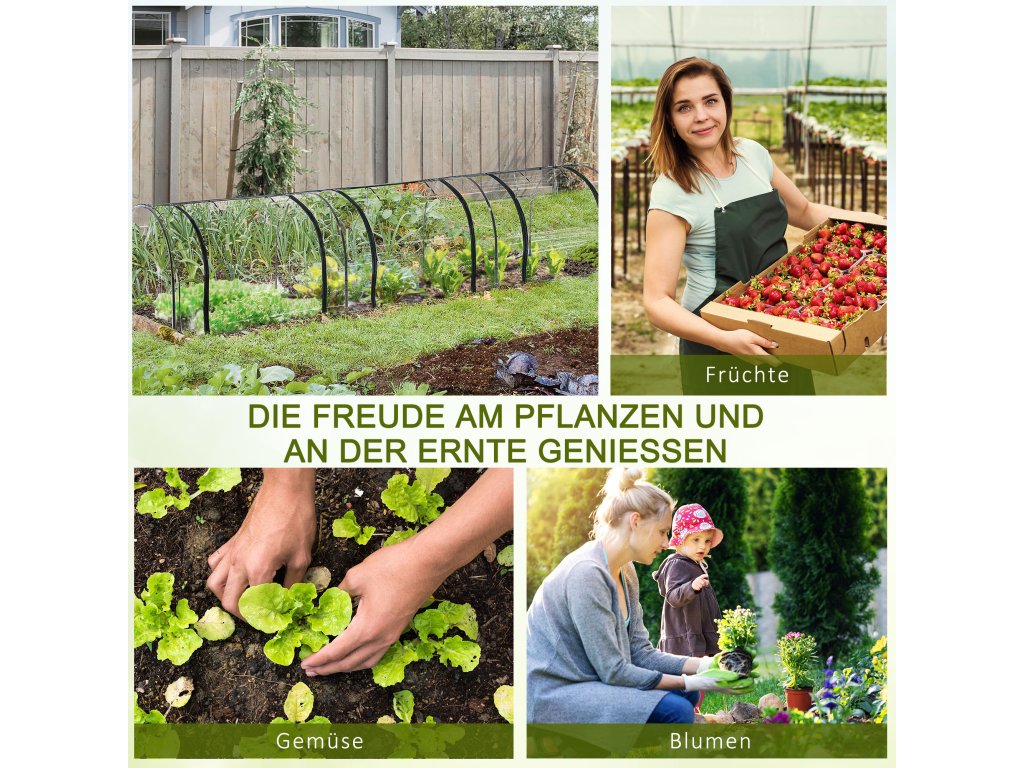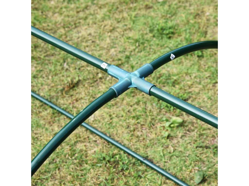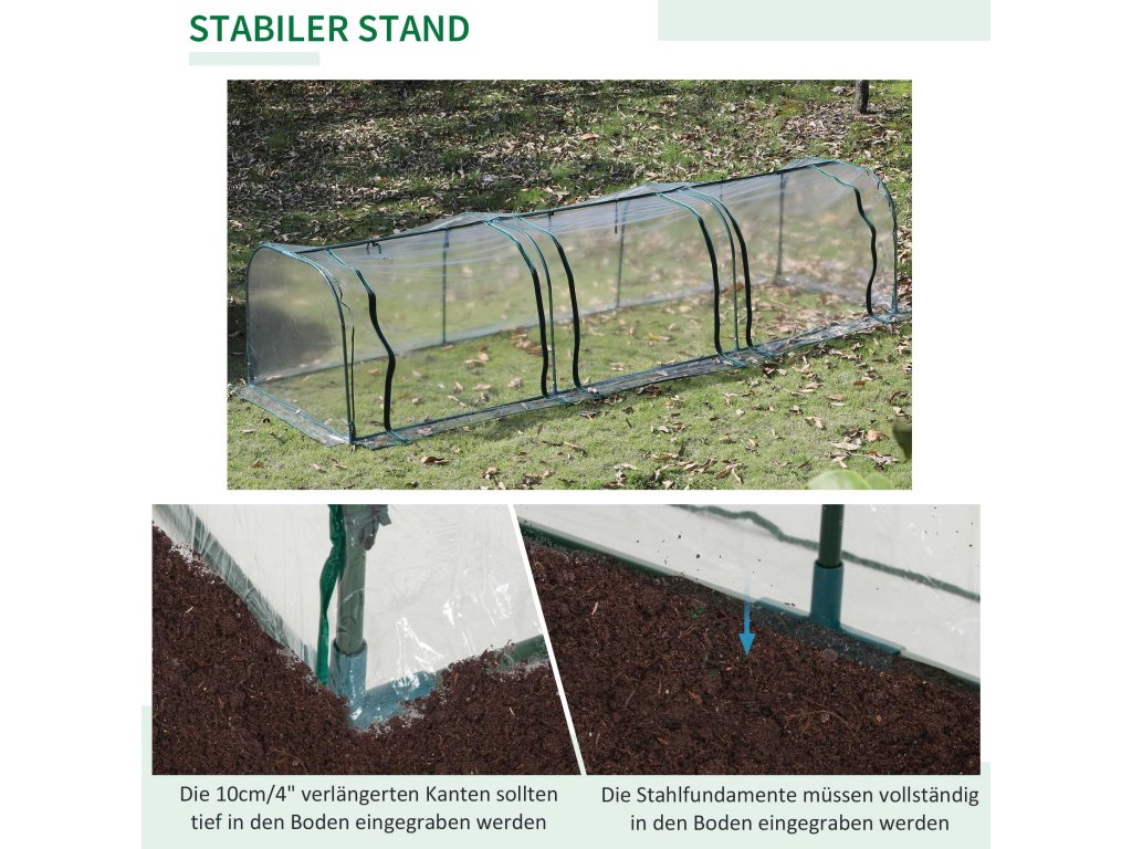 ✔ Tip: Folie je na každé straně o 10 cm delší než kovové trubky. Díky tomu lze spodní okraj zahrabat do země nebo zatížit kameny. Díky tomu je skleník stabilnější
