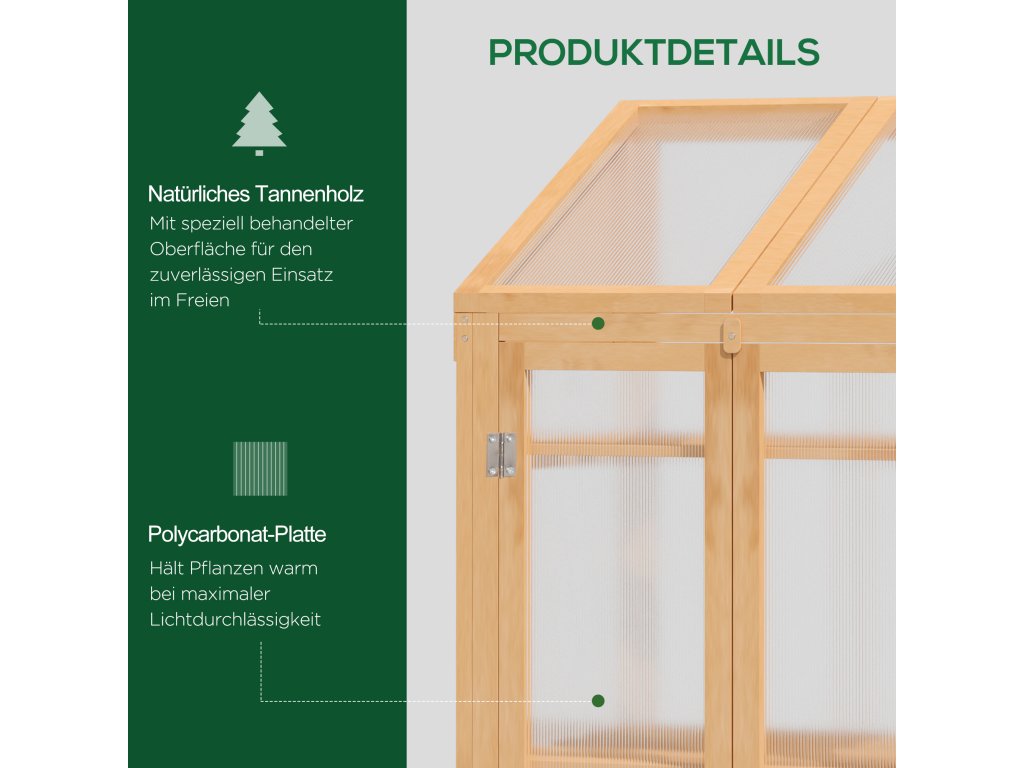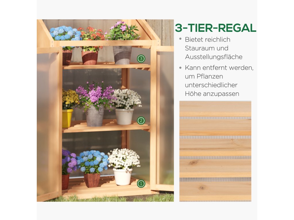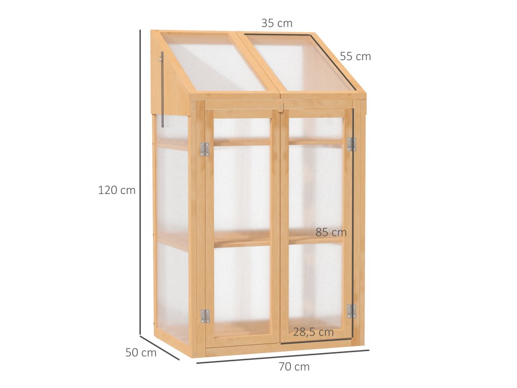 Mini skleník od společnosti Outsunny je ideální pro péči o rostliny. Robustní rám smrkového skleníku zaručuje stabilitu a průhledné polykarbonátové panely zajišťují optimální přísun světla a akumulaci tepla, což je ideální pro klíčení semen nebo ochranu rostlin ke konci sezóny. Se třemi odnímatelnými policemi pro uspořádání rostlin. Tento skleník poskytuje ideální teploty pro zdravý růst rostlin.