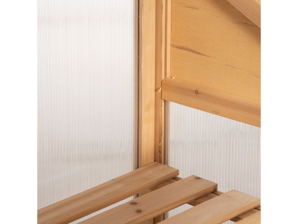 Panelová konstrukce zabraňuje vzniku louží a několik úrovní poskytuje dostatek prostoru pro květiny, zeleninu, ovoce a další rostliny v tomto miniskleníku.