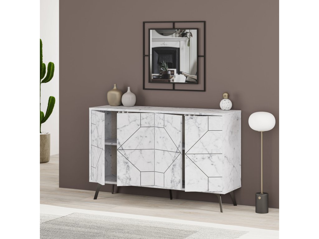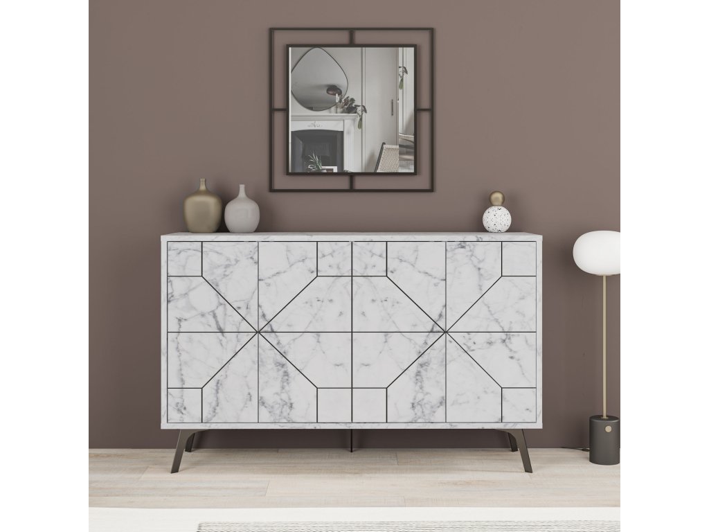 Víceúčelová skříňka DUNE je vyrobená v dekoru bílého mramoru a její dva páry dvířek mají na sobě černé určité linie.