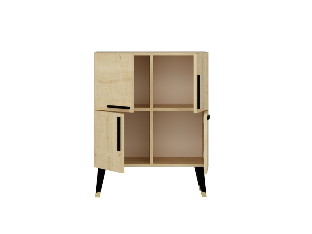 MAKRO je praktická v dekoru dub sapphire vyrobená skříňka nabízející celkem čtyři regály, opatřeny dvířky s designově rozvrženým umístěním černých madel.